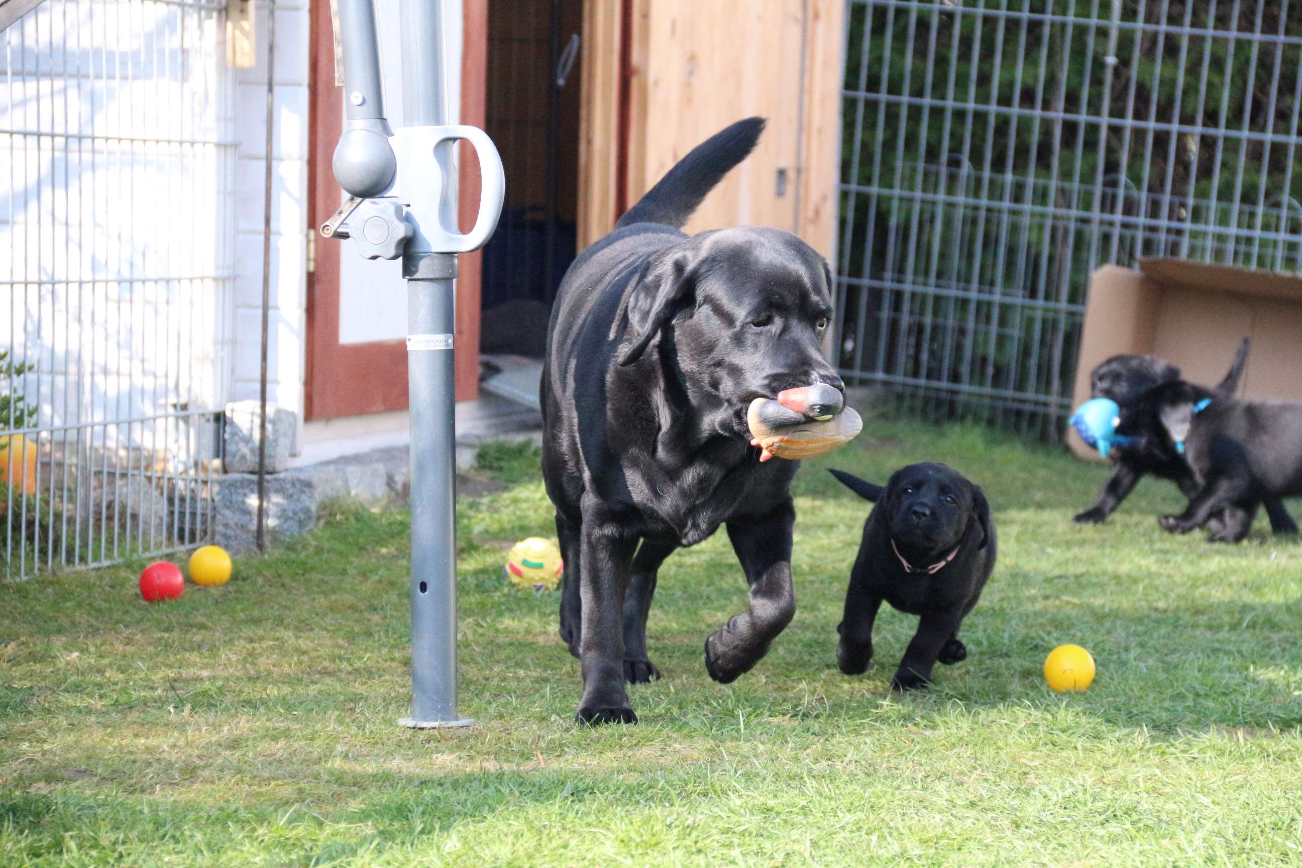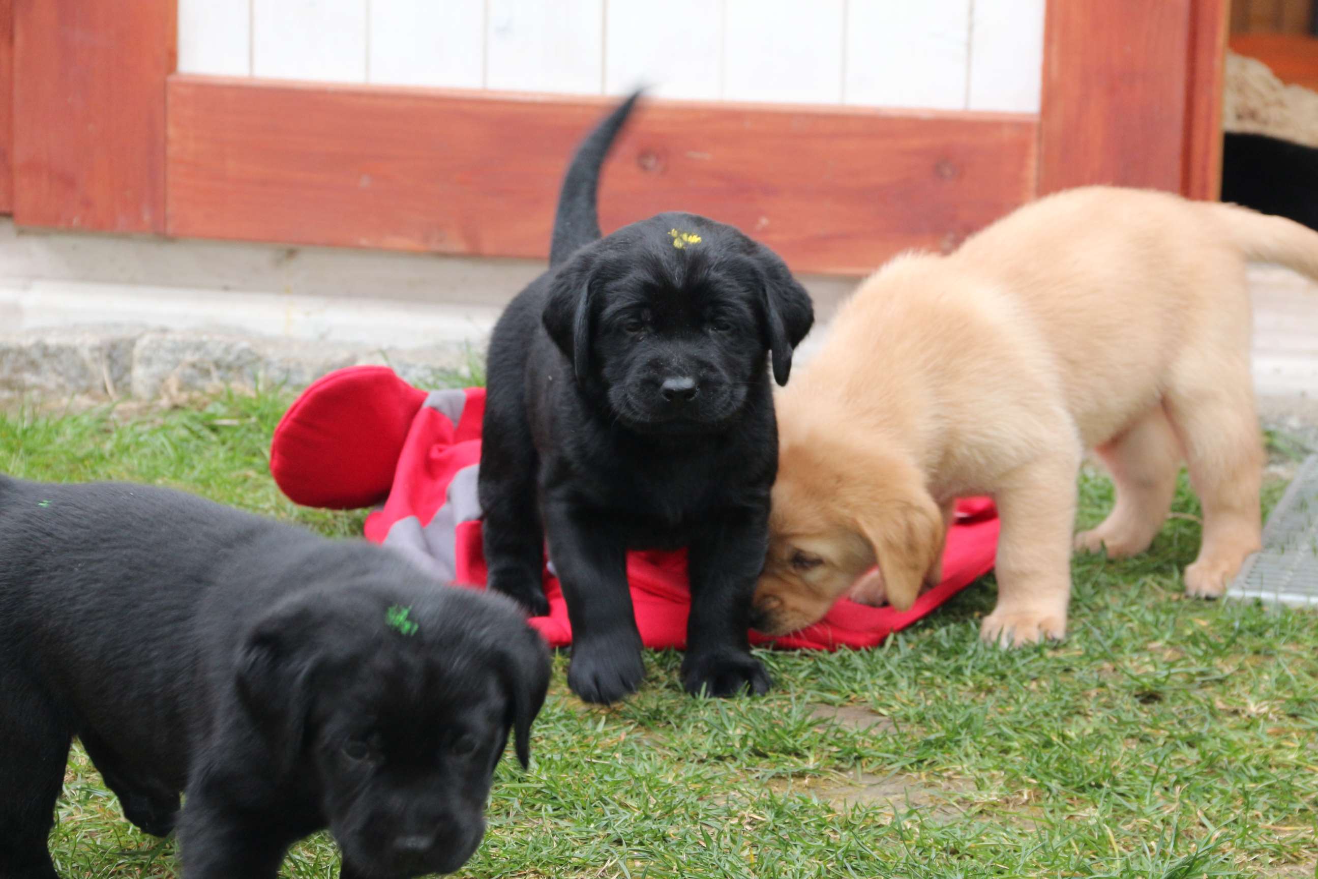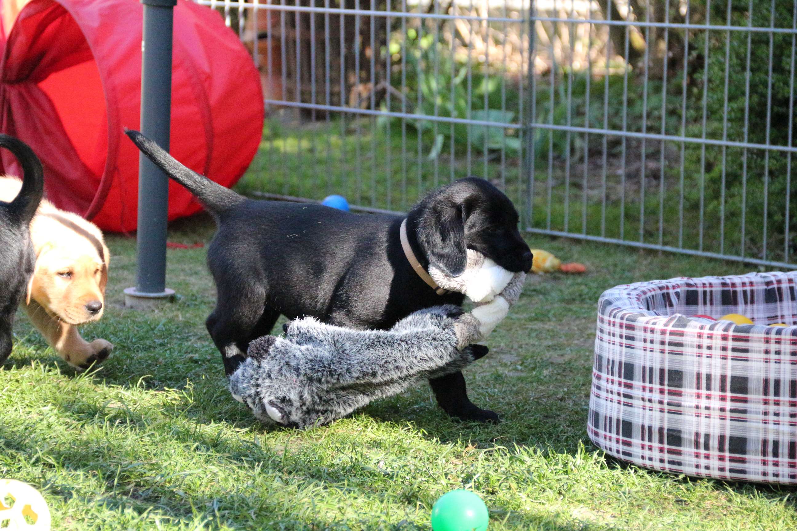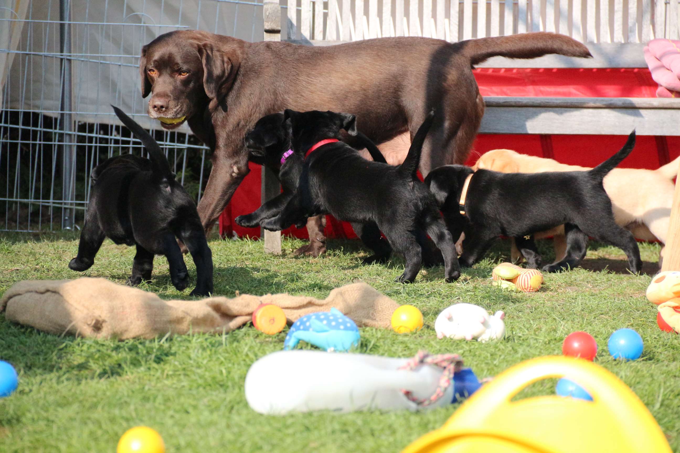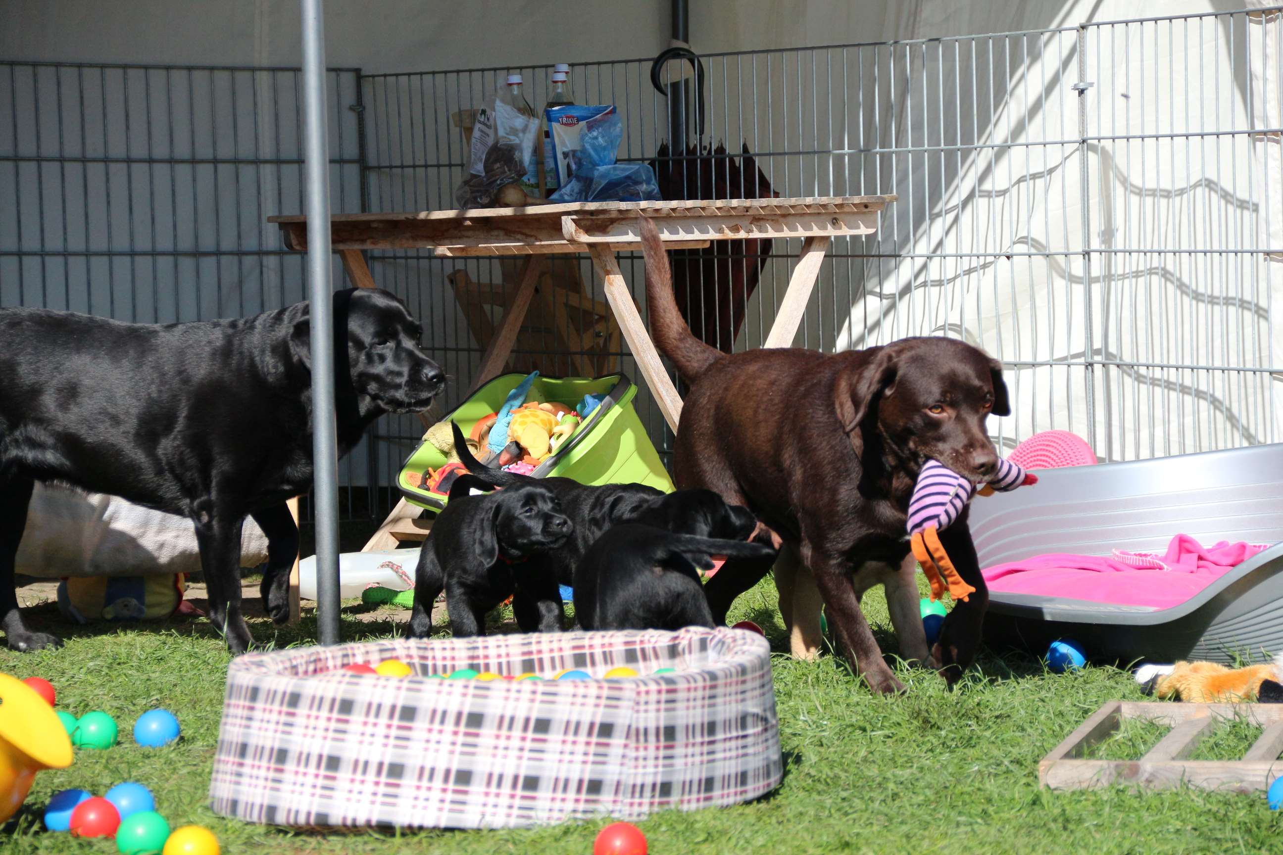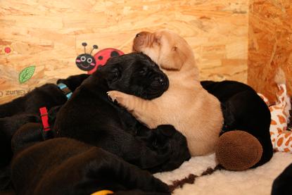 Sonntag, 12.04.15: 7 Wochen sind unsere Hundekinder nun schon. Wir hatten wieder eine sehr kurzweilige Woche mit viel Besuch und die D-chen haben sich toll entwickelt. Man kann ihnen reinstellen was man will, alles wird neugierig untersucht, ausprobiert und getestet. Ich kann viel schreiben, aber ich denke, die Bilder sprechen Bände. Emma und Luna sind schon fleissig am erziehen und machen ihre Sache hervorragend! Wir sind nun täglich von morgens bis abends draussen mit der Bande. Nachts melden sie sich 1 - 2x, wenn sie “müssen” und schlafen bald darauf wieder brav weiter. Bin einfach nur begeistert von allen!! Sie haben bereits die Leine kennengelernt und ersten Spaß mit dem Dummy gehabt. An dieser Stelle ein ganz liebes “Danke” an meine Freundin Marion, die mir immer einen guten Rat weiß. DU BIST DIE BESTE!! Leine, Dummy und bald auch Autofahren stehen nun täglich auf dem Programm... Ich wünsche allen viel Freude mit den Bildern der 7vergangenen Woche :) Die Gewichte lagen heute zwischen 4,7 kg (“Paula” mit dem pinken Band) und 5,9 kg (“Caruso” mit dem grünen Band - er hat “Ben”, unseren hellen Prachtkerl jetzt überholt). Morgen werden die Welpen gechipt und am Mittwoch kommen dann die Zuchtwarte zur Kontrolle... meine geliebte Welpenzeit geht langsam zu Ende und immer wieder kullern deswegen die Tränen :`( so schön und so lange drauf gewartet...