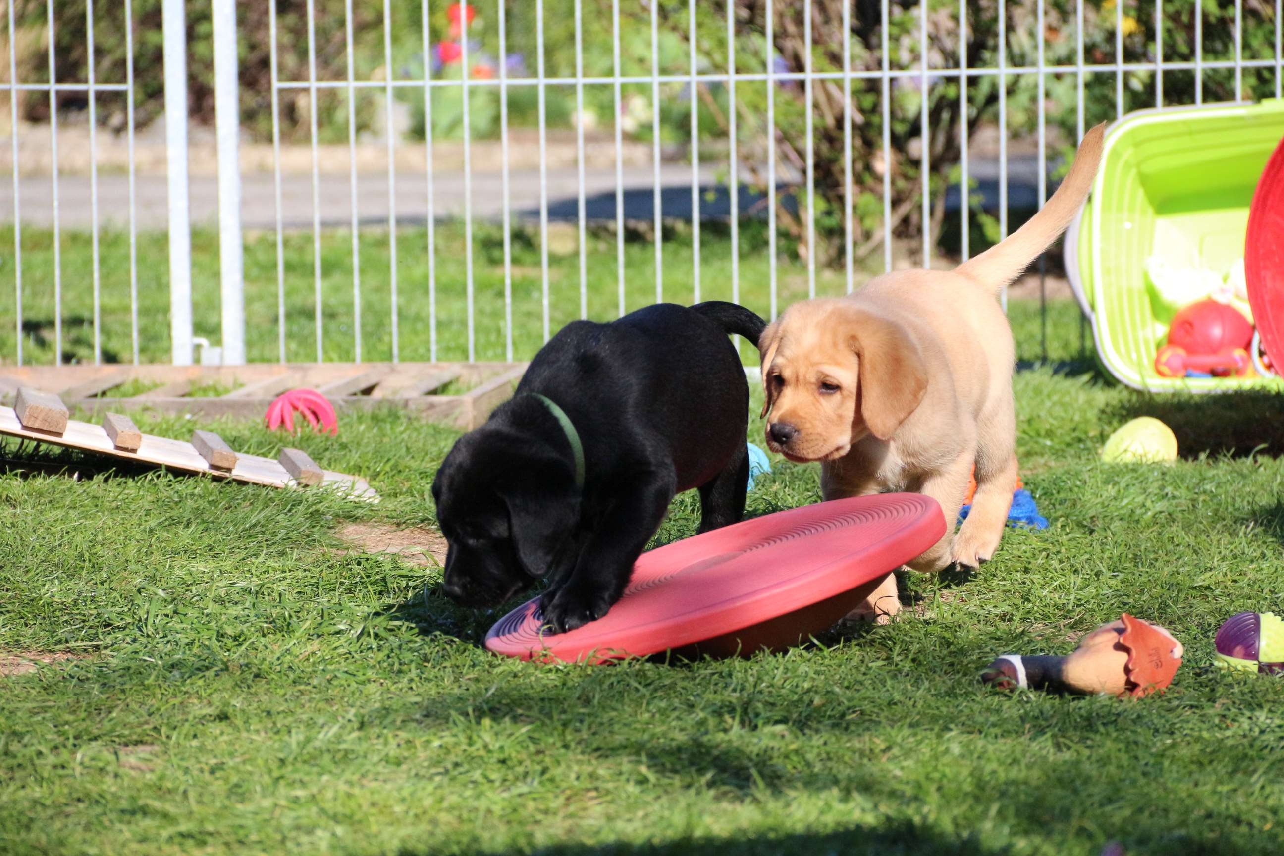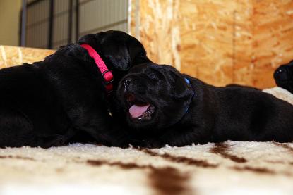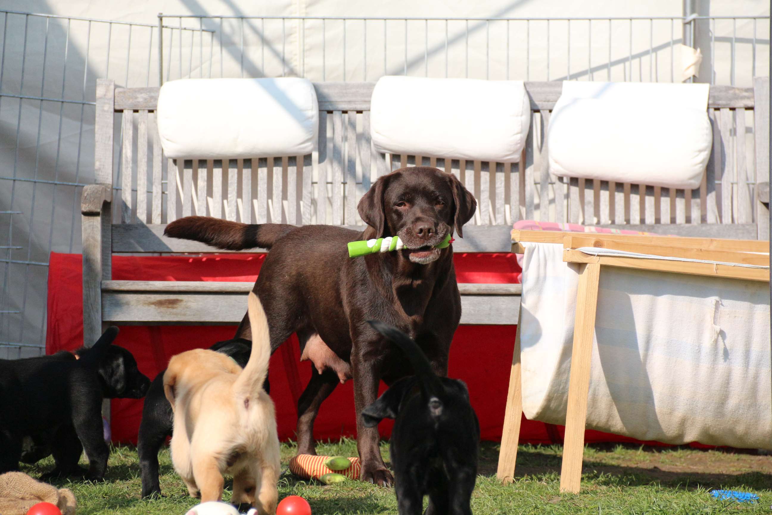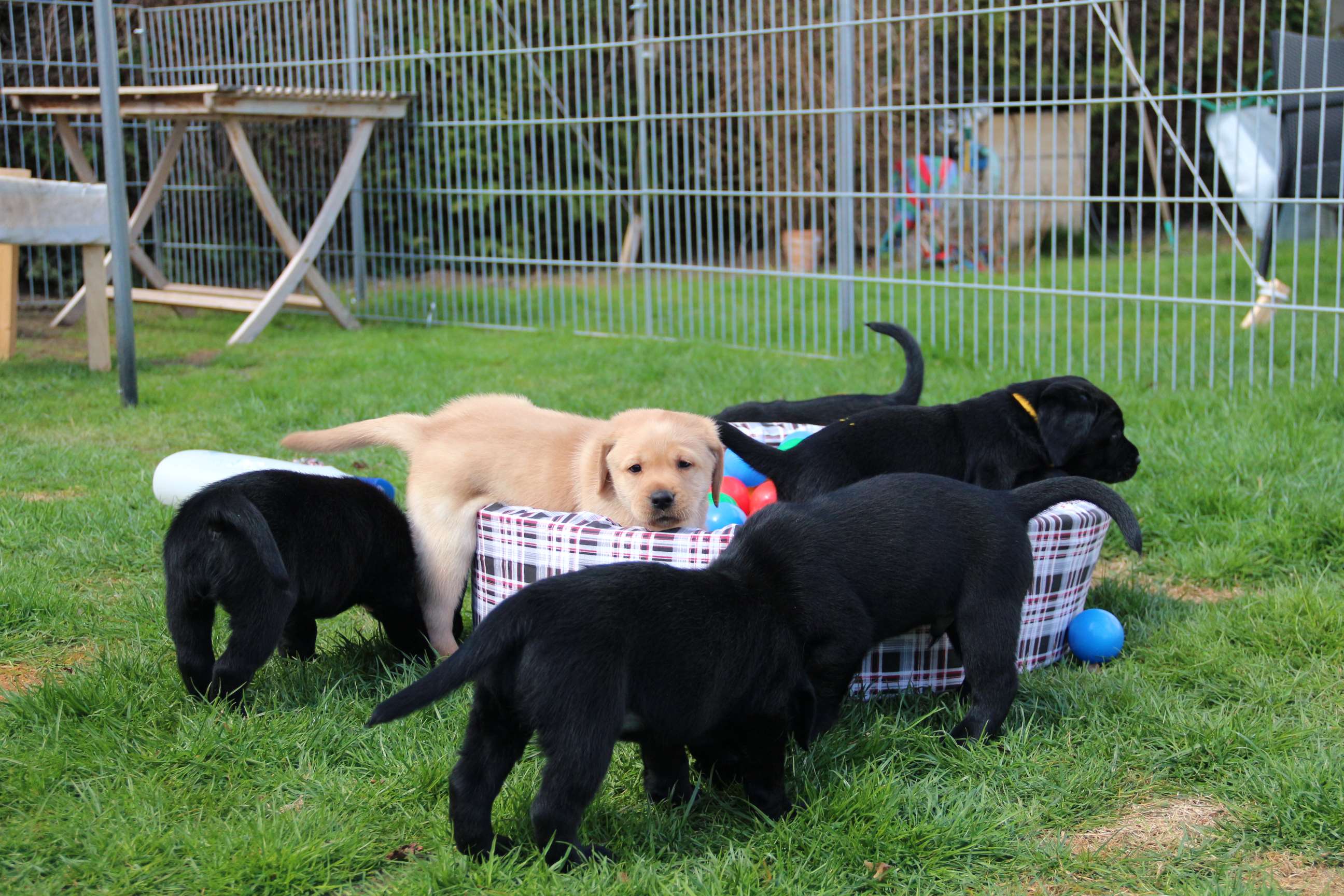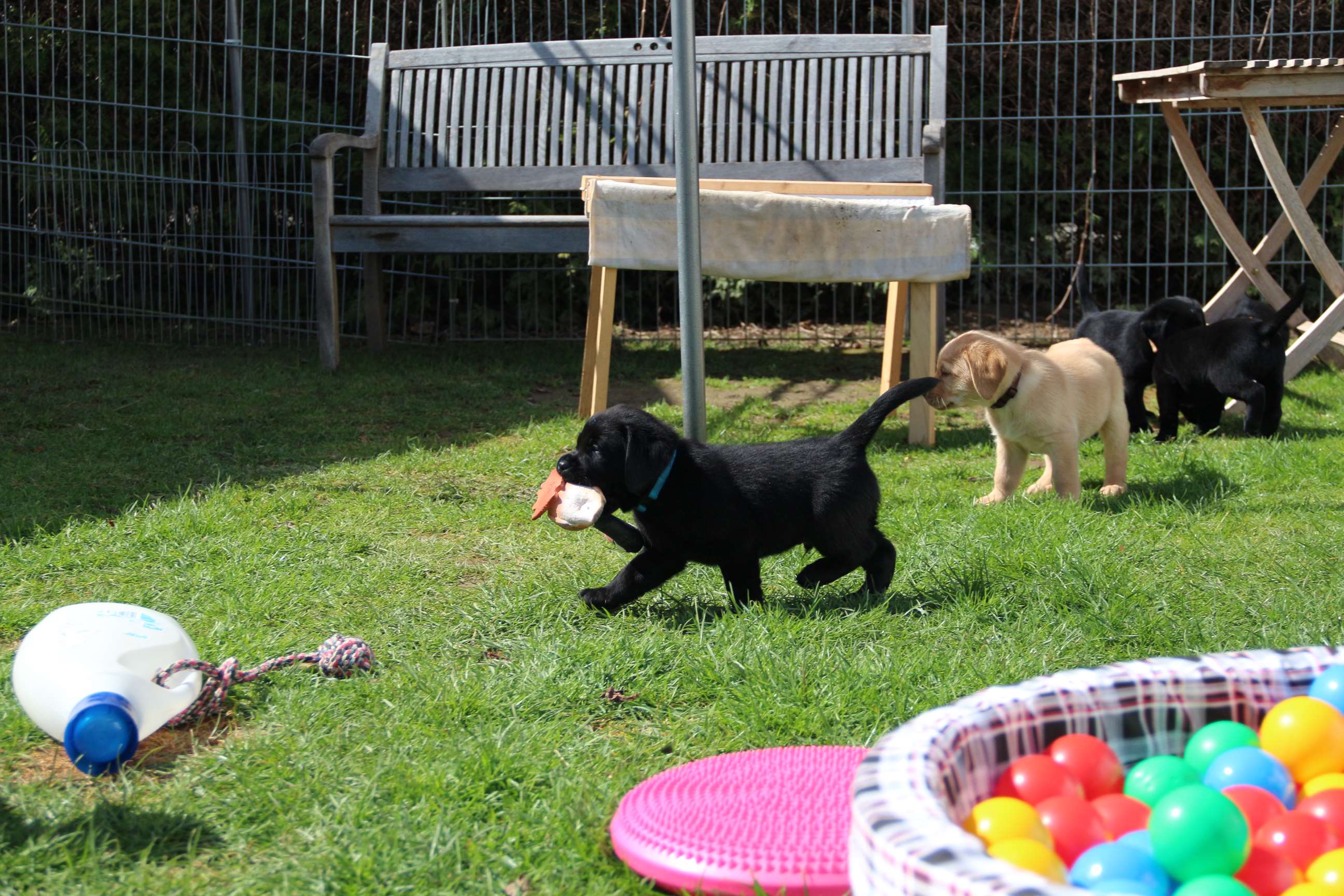 Sonntag, 12.04.15: 7 Wochen sind unsere Hundekinder nun schon. Wir hatten wieder eine sehr kurzweilige Woche mit viel Besuch und die D-chen haben sich toll entwickelt. Man kann ihnen reinstellen was man will, alles wird neugierig untersucht, ausprobiert und getestet. Ich kann viel schreiben, aber ich denke, die Bilder sprechen Bände. Emma und Luna sind schon fleissig am erziehen und machen ihre Sache hervorragend! Wir sind nun täglich von morgens bis abends draussen mit der Bande. Nachts melden sie sich 1 - 2x, wenn sie “müssen” und schlafen bald darauf wieder brav weiter. Bin einfach nur begeistert von allen!! Sie haben bereits die Leine kennengelernt und ersten Spaß mit dem Dummy gehabt. An dieser Stelle ein ganz liebes “Danke” an meine Freundin Marion, die mir immer einen guten Rat weiß. DU BIST DIE BESTE!! Leine, Dummy und bald auch Autofahren stehen nun täglich auf dem Programm... Ich wünsche allen viel Freude mit den Bildern der 7vergangenen Woche :) Die Gewichte lagen heute zwischen 4,7 kg (“Paula” mit dem pinken Band) und 5,9 kg (“Caruso” mit dem grünen Band - er hat “Ben”, unseren hellen Prachtkerl jetzt überholt). Morgen werden die Welpen gechipt und am Mittwoch kommen dann die Zuchtwarte zur Kontrolle... meine geliebte Welpenzeit geht langsam zu Ende und immer wieder kullern deswegen die Tränen :`( so schön und so lange drauf gewartet...