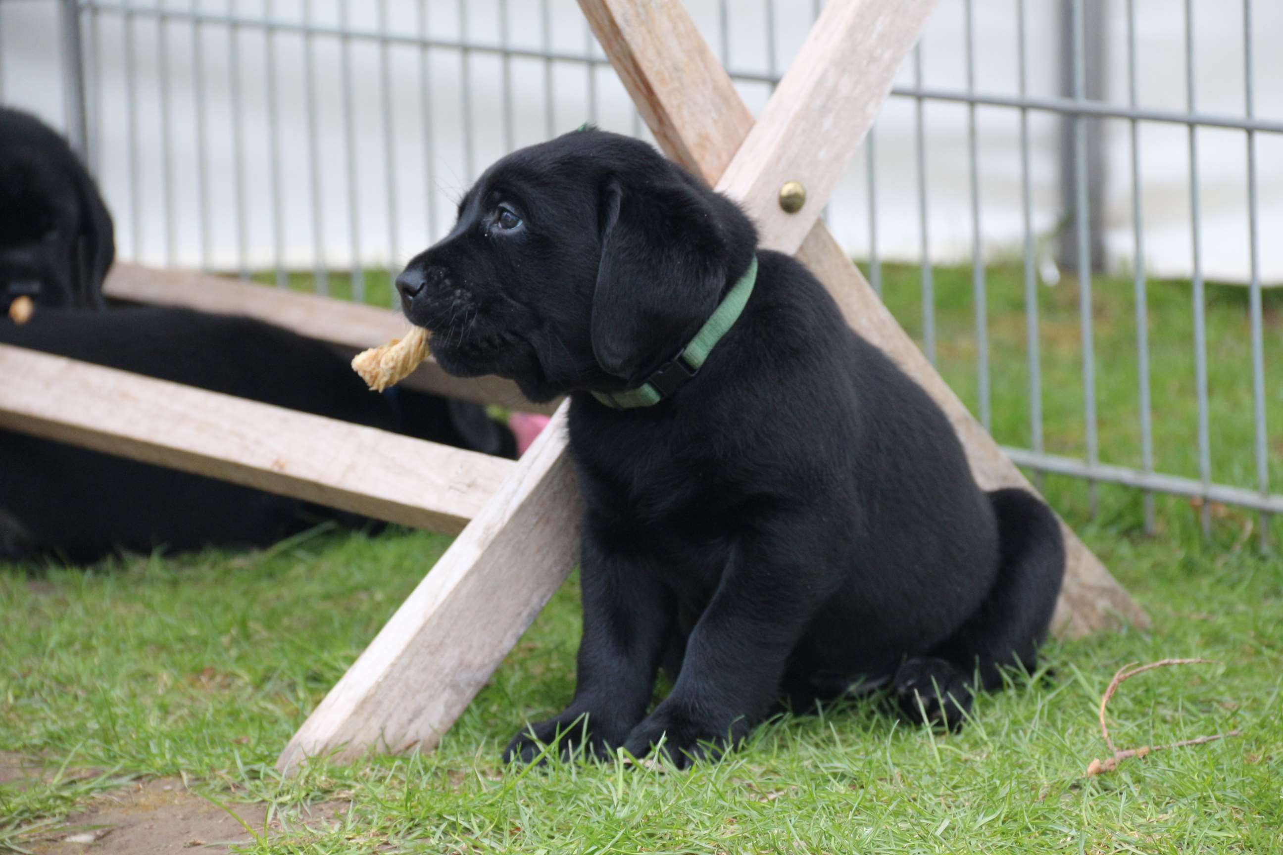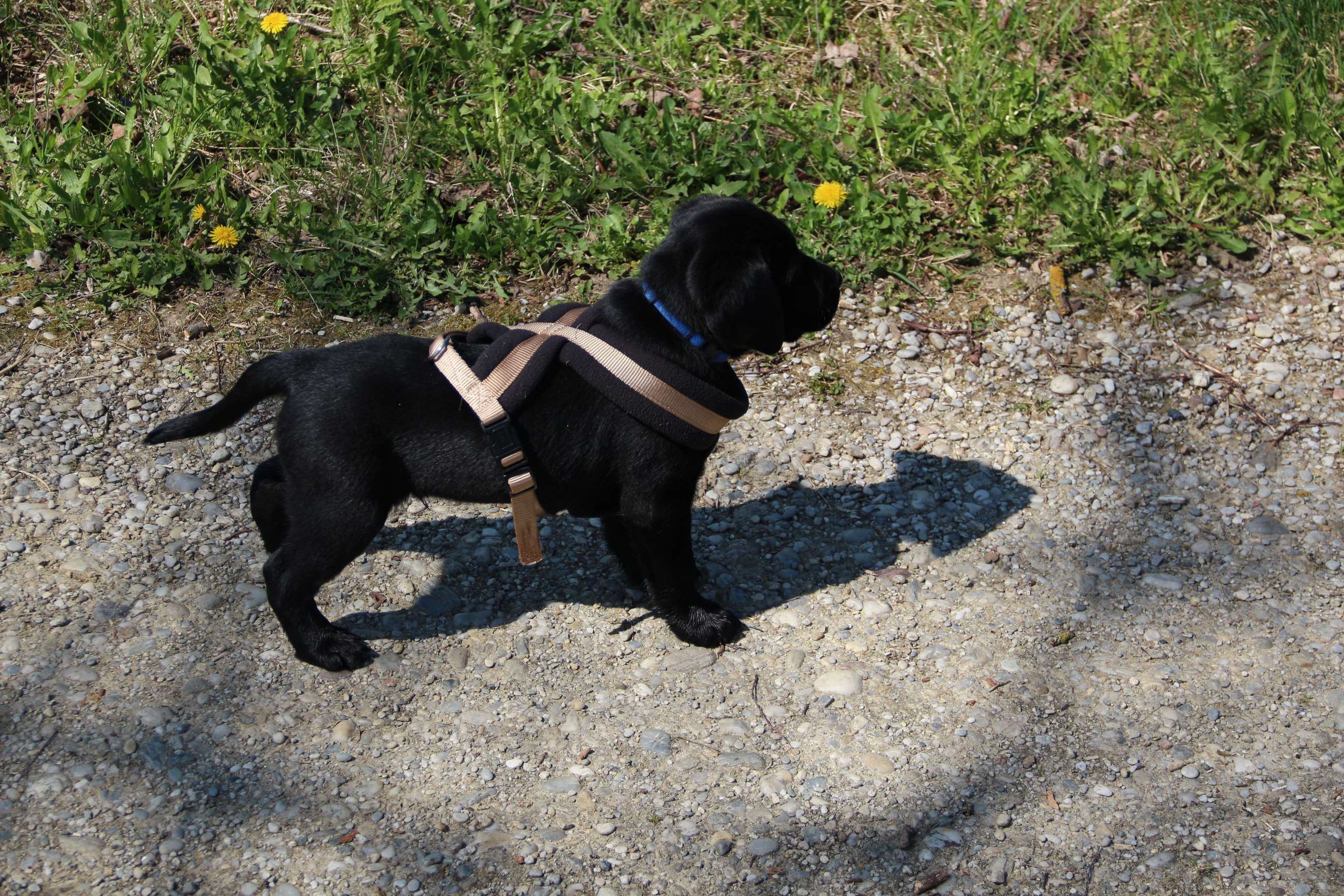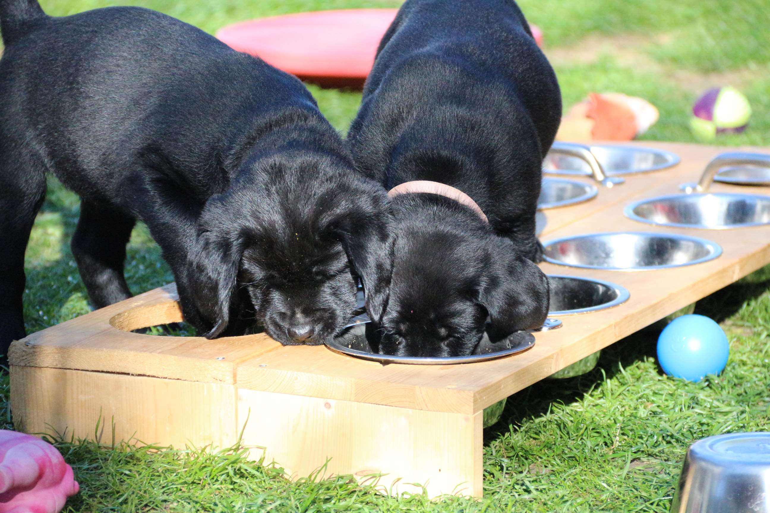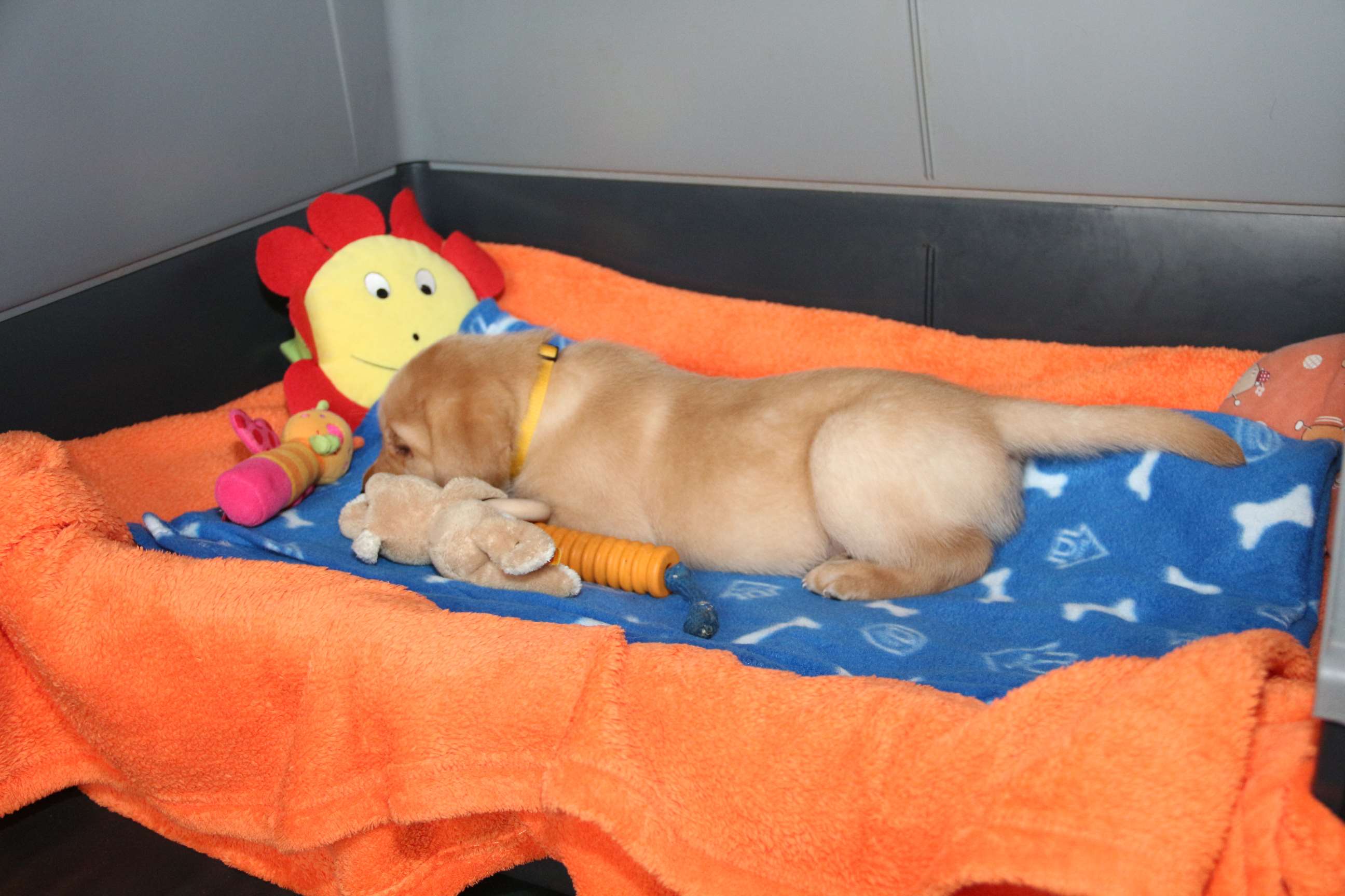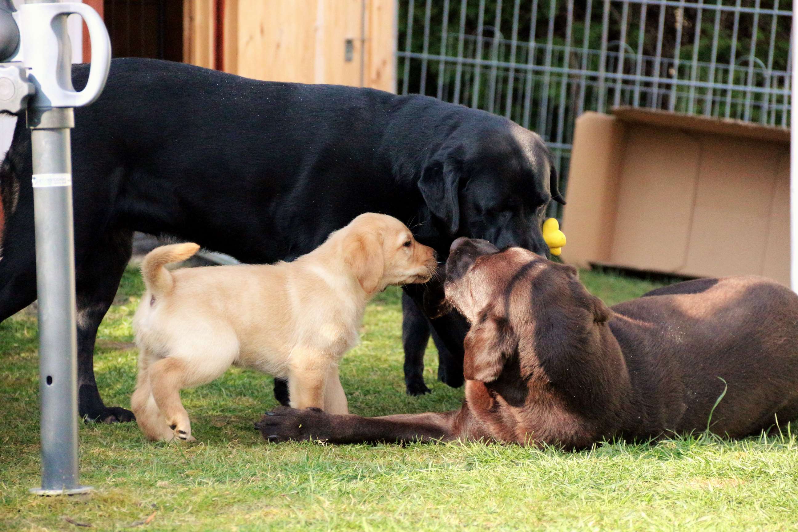 Sonntag, 12.04.15: 7 Wochen sind unsere Hundekinder nun schon. Wir hatten wieder eine sehr kurzweilige Woche mit viel Besuch und die D-chen haben sich toll entwickelt. Man kann ihnen reinstellen was man will, alles wird neugierig untersucht, ausprobiert und getestet. Ich kann viel schreiben, aber ich denke, die Bilder sprechen Bände. Emma und Luna sind schon fleissig am erziehen und machen ihre Sache hervorragend! Wir sind nun täglich von morgens bis abends draussen mit der Bande. Nachts melden sie sich 1 - 2x, wenn sie “müssen” und schlafen bald darauf wieder brav weiter. Bin einfach nur begeistert von allen!! Sie haben bereits die Leine kennengelernt und ersten Spaß mit dem Dummy gehabt. An dieser Stelle ein ganz liebes “Danke” an meine Freundin Marion, die mir immer einen guten Rat weiß. DU BIST DIE BESTE!! Leine, Dummy und bald auch Autofahren stehen nun täglich auf dem Programm... Ich wünsche allen viel Freude mit den Bildern der 7vergangenen Woche :) Die Gewichte lagen heute zwischen 4,7 kg (“Paula” mit dem pinken Band) und 5,9 kg (“Caruso” mit dem grünen Band - er hat “Ben”, unseren hellen Prachtkerl jetzt überholt). Morgen werden die Welpen gechipt und am Mittwoch kommen dann die Zuchtwarte zur Kontrolle... meine geliebte Welpenzeit geht langsam zu Ende und immer wieder kullern deswegen die Tränen :`( so schön und so lange drauf gewartet...