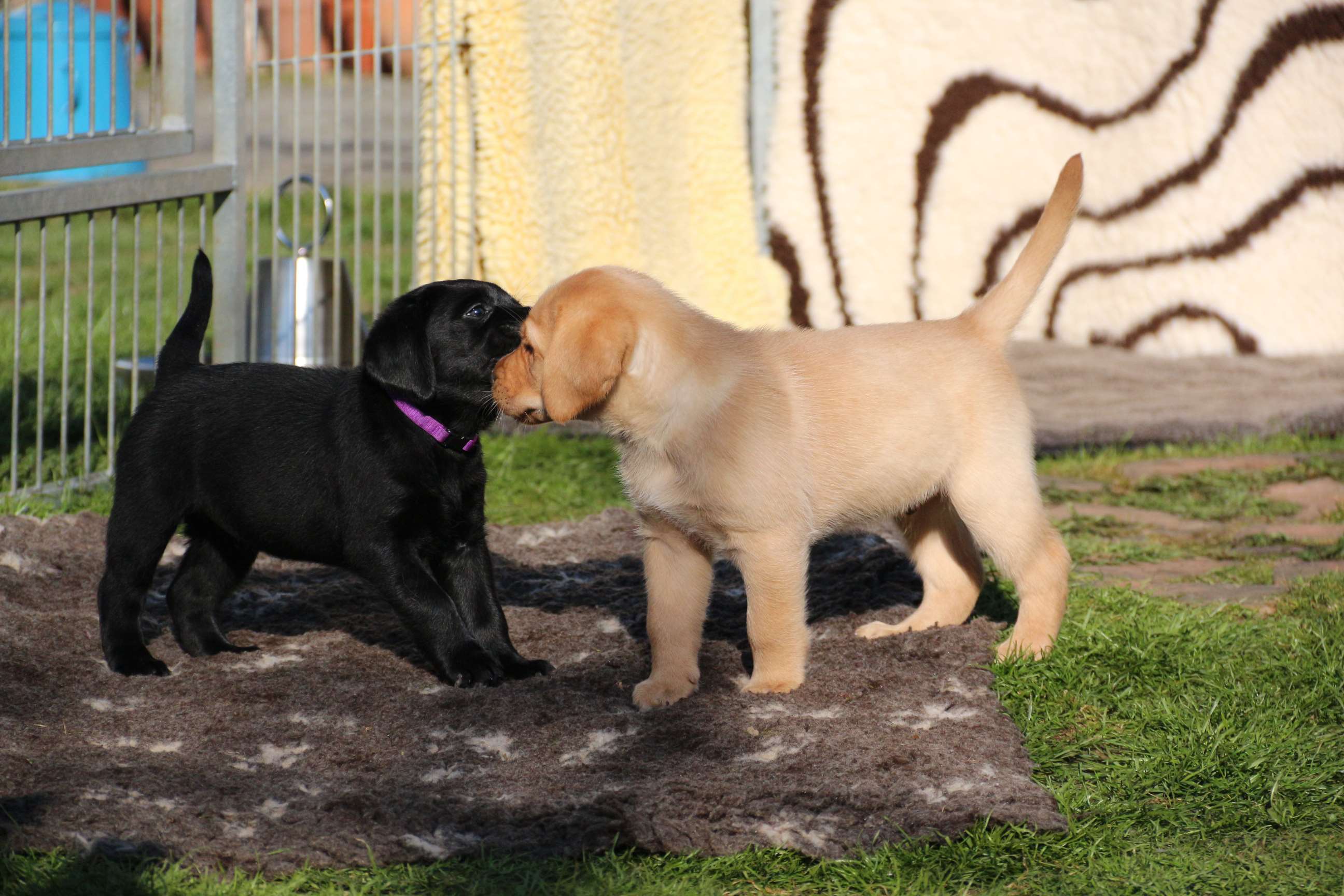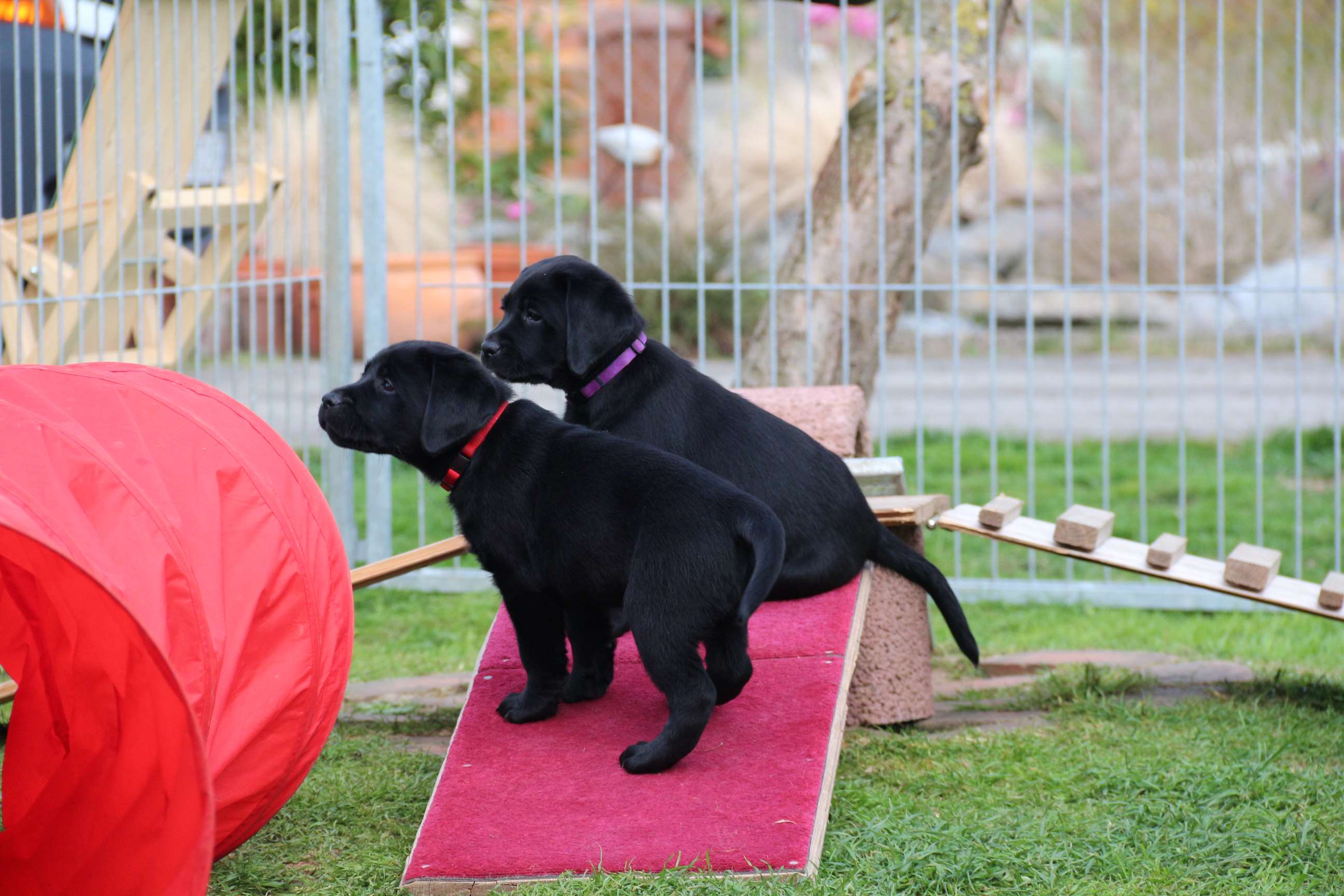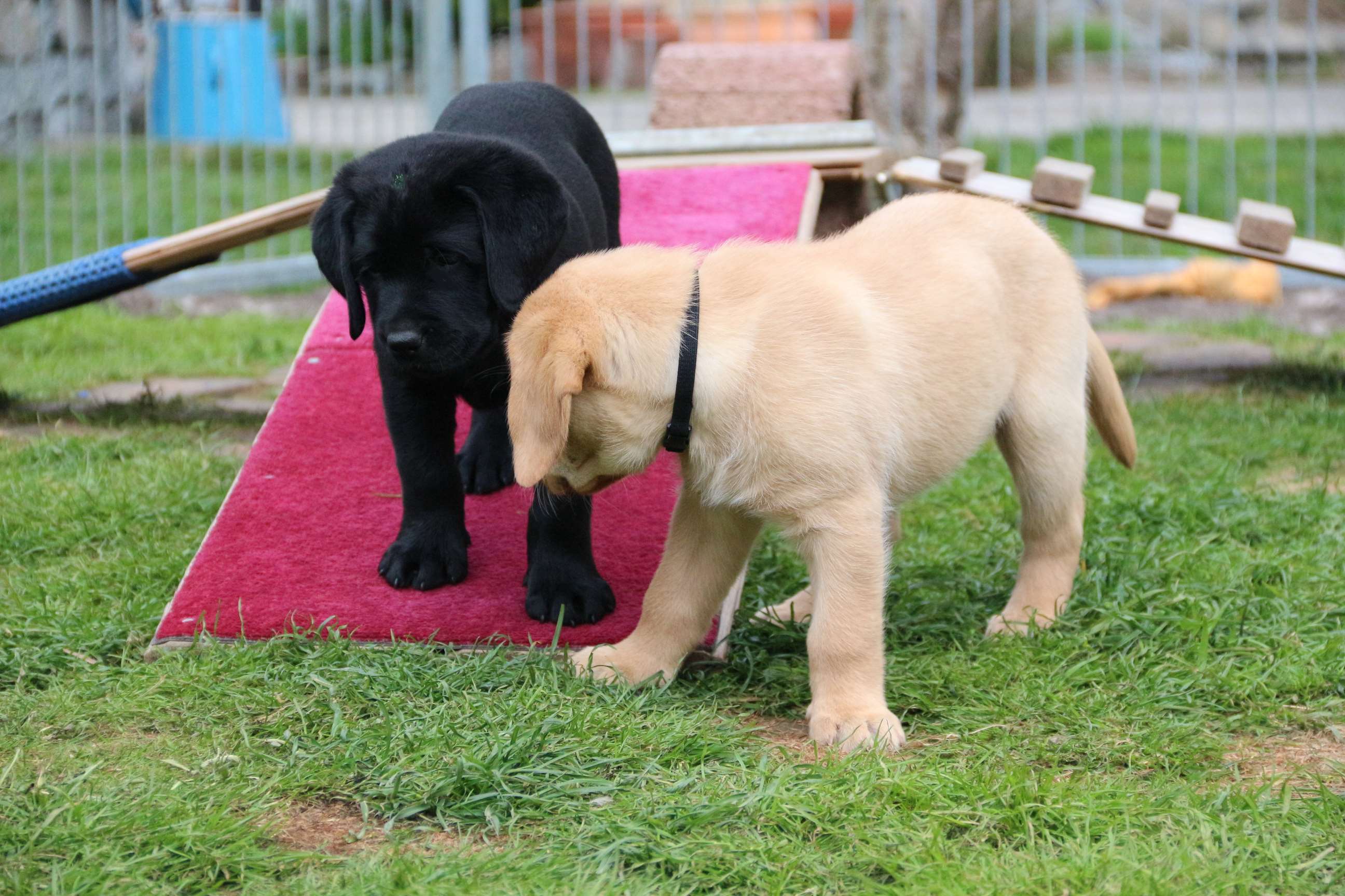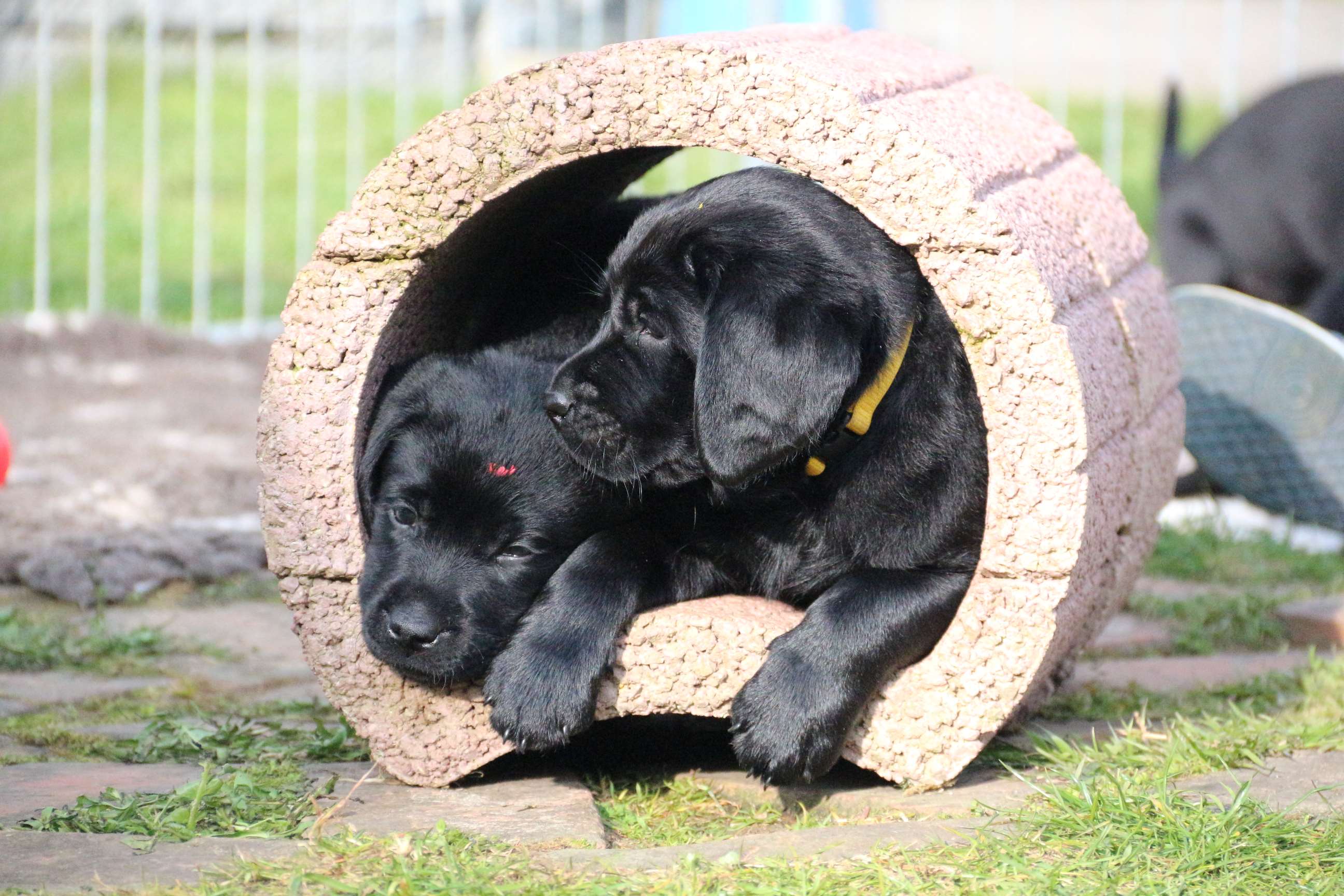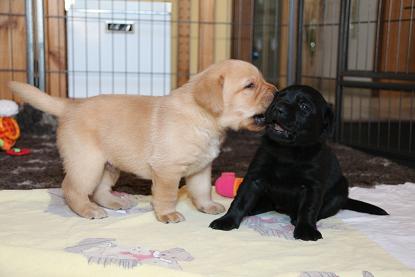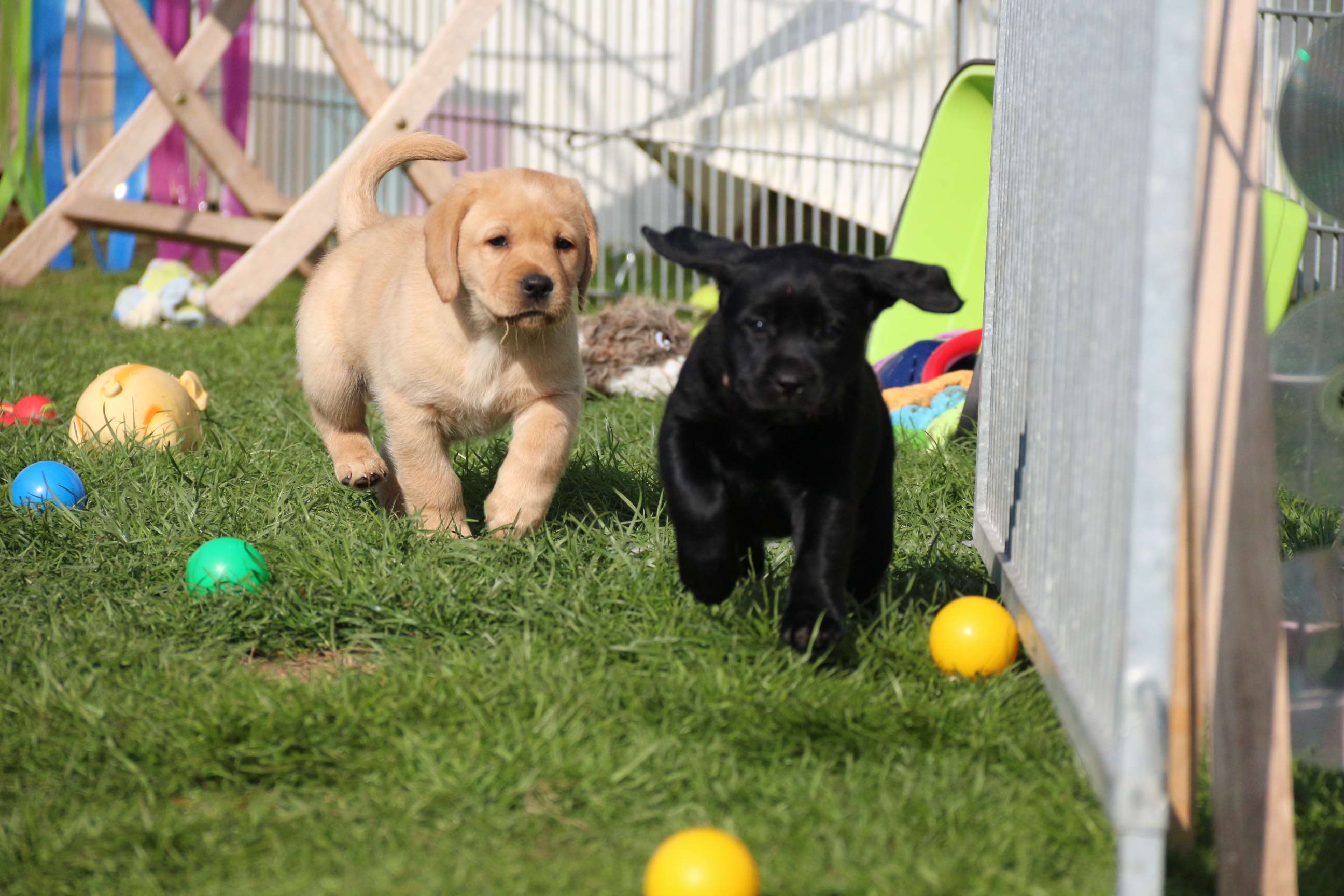 Sonntag, 12.04.15: 7 Wochen sind unsere Hundekinder nun schon. Wir hatten wieder eine sehr kurzweilige Woche mit viel Besuch und die D-chen haben sich toll entwickelt. Man kann ihnen reinstellen was man will, alles wird neugierig untersucht, ausprobiert und getestet. Ich kann viel schreiben, aber ich denke, die Bilder sprechen Bände. Emma und Luna sind schon fleissig am erziehen und machen ihre Sache hervorragend! Wir sind nun täglich von morgens bis abends draussen mit der Bande. Nachts melden sie sich 1 - 2x, wenn sie “müssen” und schlafen bald darauf wieder brav weiter. Bin einfach nur begeistert von allen!! Sie haben bereits die Leine kennengelernt und ersten Spaß mit dem Dummy gehabt. An dieser Stelle ein ganz liebes “Danke” an meine Freundin Marion, die mir immer einen guten Rat weiß. DU BIST DIE BESTE!! Leine, Dummy und bald auch Autofahren stehen nun täglich auf dem Programm... Ich wünsche allen viel Freude mit den Bildern der 7vergangenen Woche :) Die Gewichte lagen heute zwischen 4,7 kg (“Paula” mit dem pinken Band) und 5,9 kg (“Caruso” mit dem grünen Band - er hat “Ben”, unseren hellen Prachtkerl jetzt überholt). Morgen werden die Welpen gechipt und am Mittwoch kommen dann die Zuchtwarte zur Kontrolle... meine geliebte Welpenzeit geht langsam zu Ende und immer wieder kullern deswegen die Tränen :`( so schön und so lange drauf gewartet...