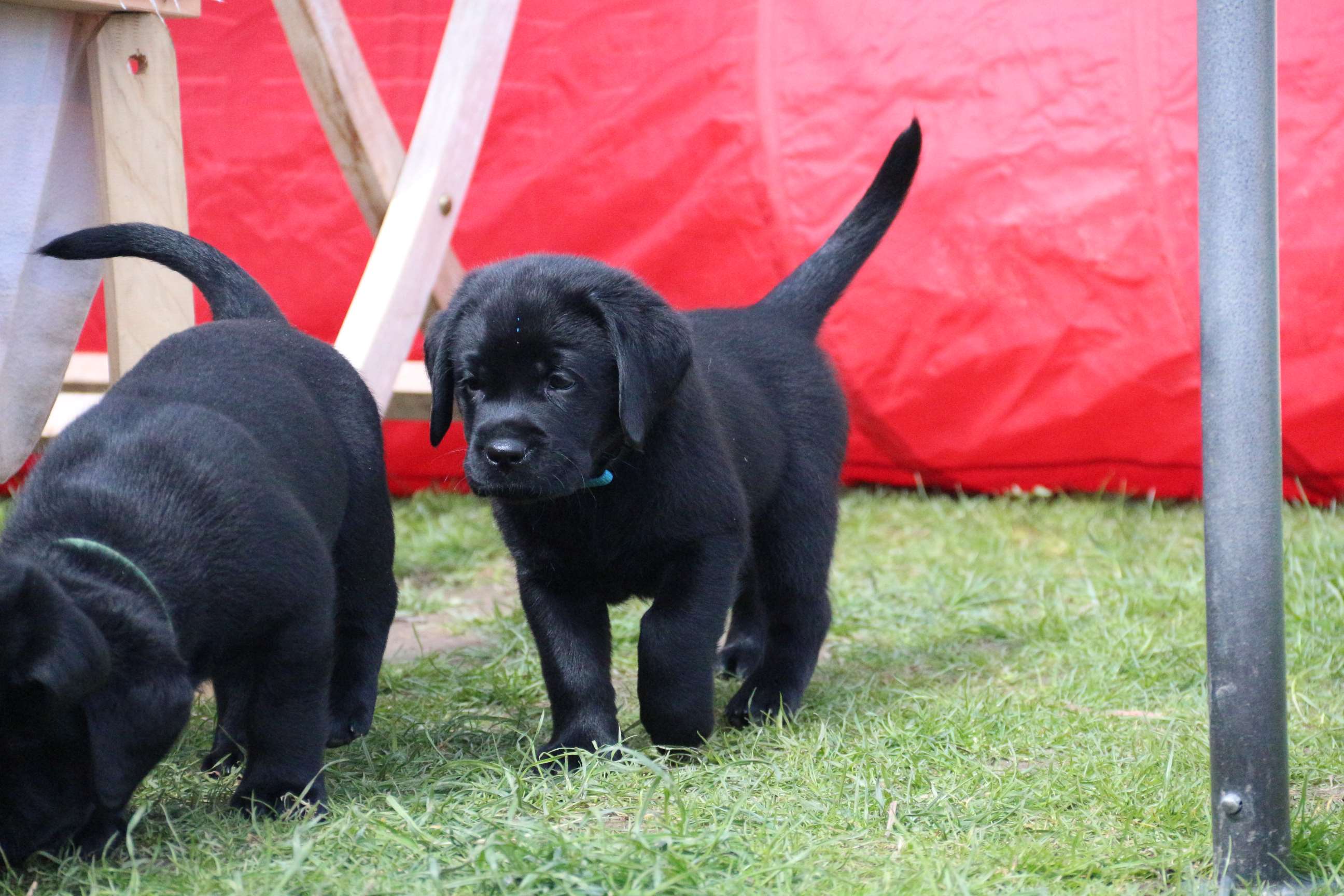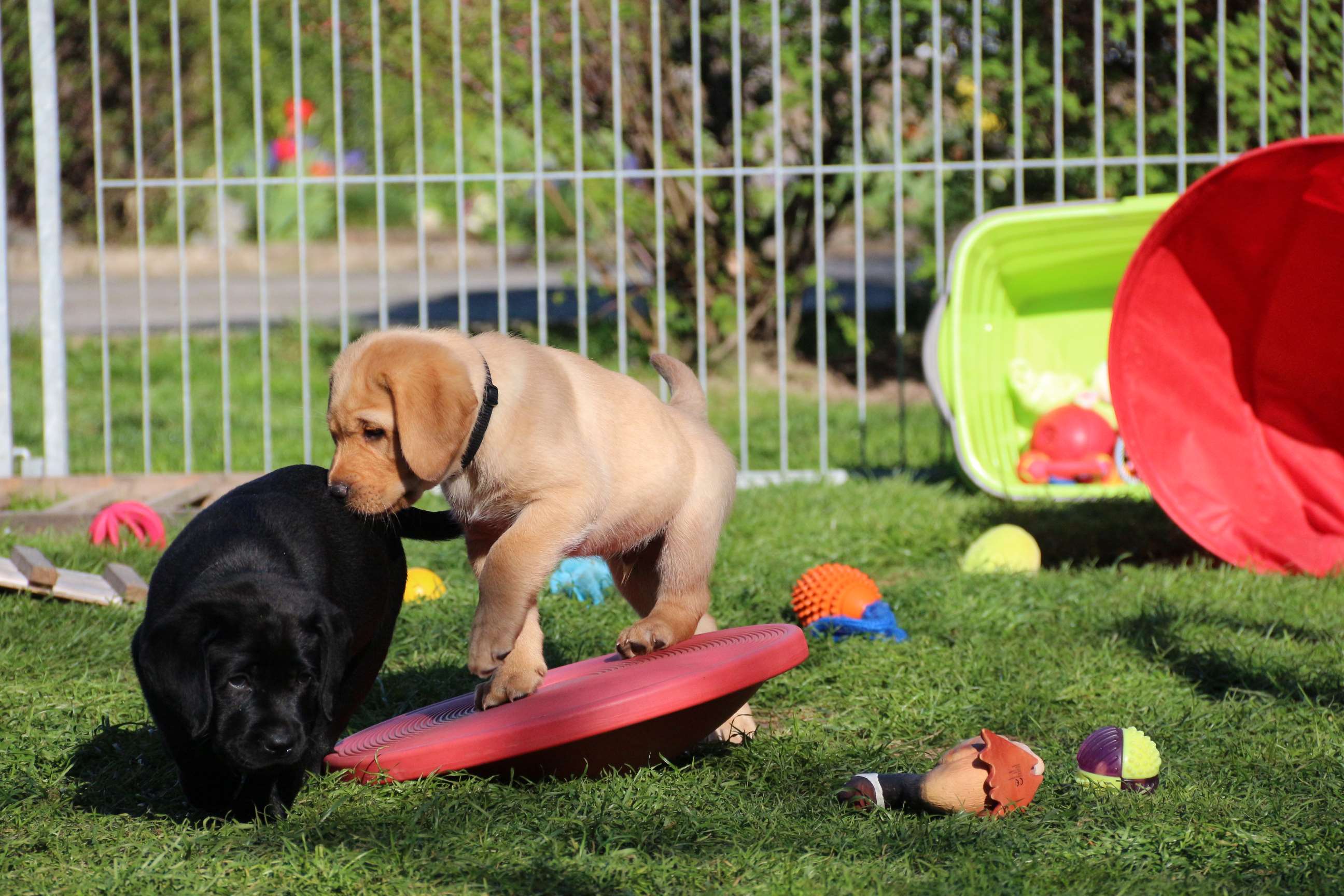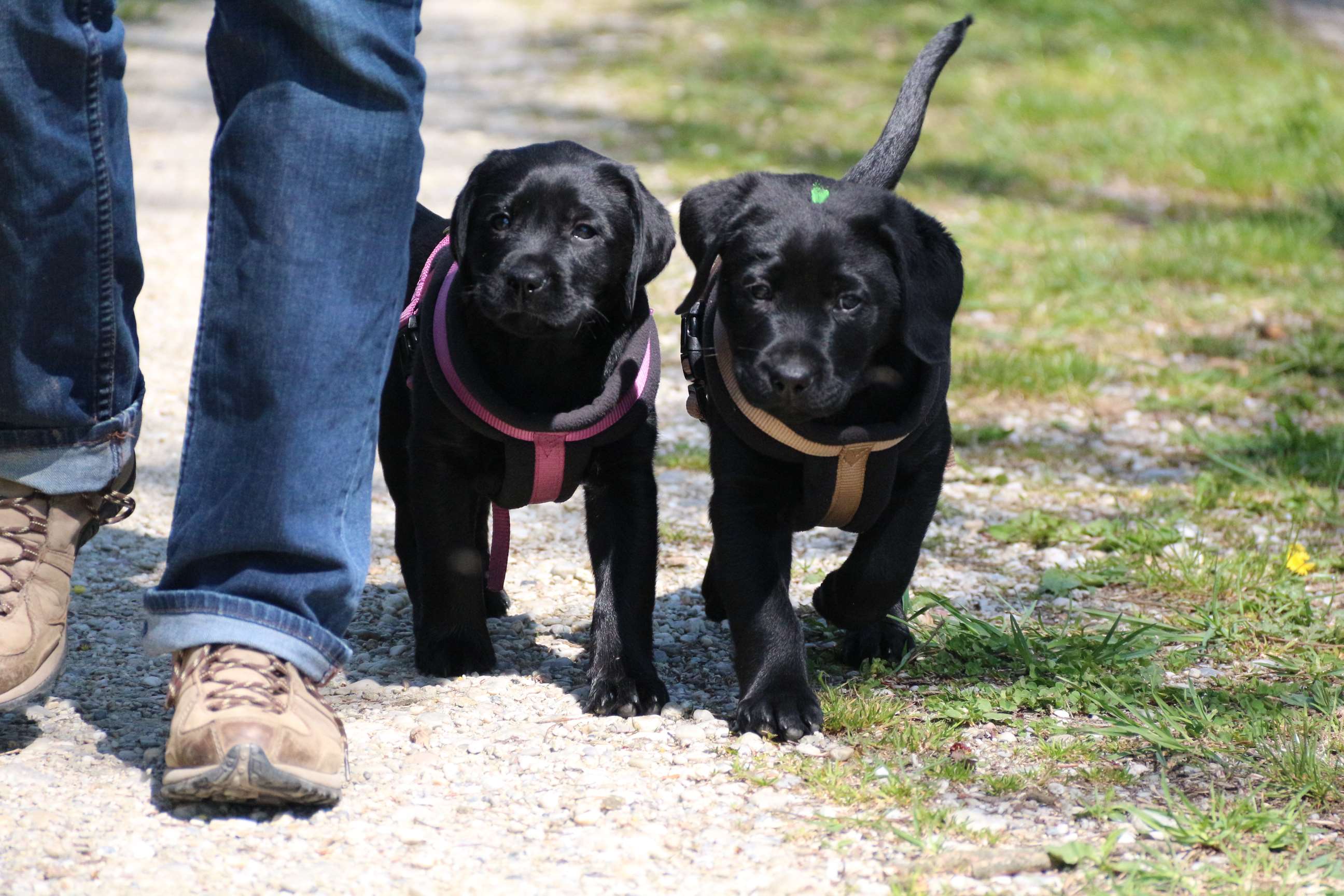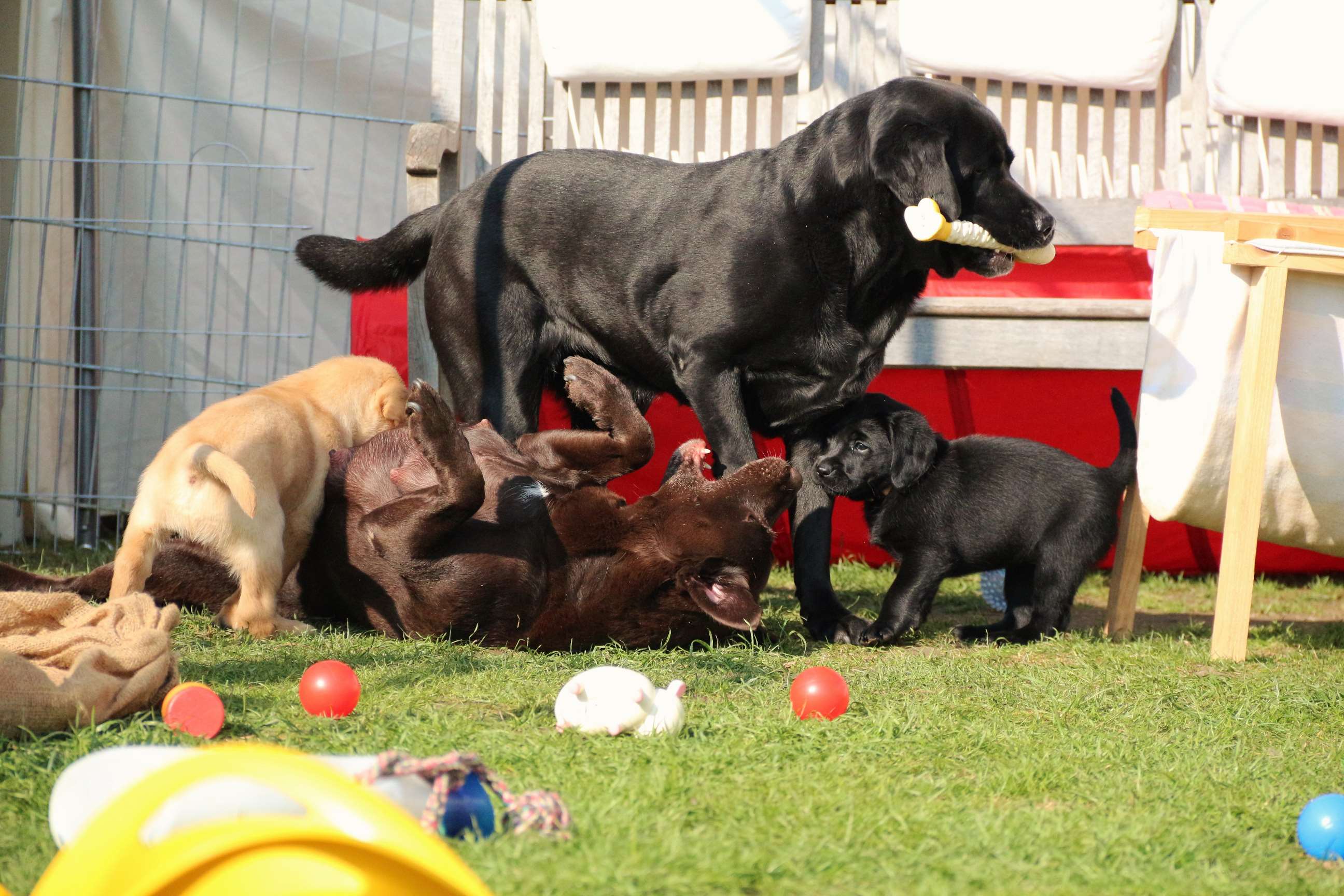 Sonntag, 12.04.15: 7 Wochen sind unsere Hundekinder nun schon. Wir hatten wieder eine sehr kurzweilige Woche mit viel Besuch und die D-chen haben sich toll entwickelt. Man kann ihnen reinstellen was man will, alles wird neugierig untersucht, ausprobiert und getestet. Ich kann viel schreiben, aber ich denke, die Bilder sprechen Bände. Emma und Luna sind schon fleissig am erziehen und machen ihre Sache hervorragend! Wir sind nun täglich von morgens bis abends draussen mit der Bande. Nachts melden sie sich 1 - 2x, wenn sie “müssen” und schlafen bald darauf wieder brav weiter. Bin einfach nur begeistert von allen!! Sie haben bereits die Leine kennengelernt und ersten Spaß mit dem Dummy gehabt. An dieser Stelle ein ganz liebes “Danke” an meine Freundin Marion, die mir immer einen guten Rat weiß. DU BIST DIE BESTE!! Leine, Dummy und bald auch Autofahren stehen nun täglich auf dem Programm... Ich wünsche allen viel Freude mit den Bildern der 7vergangenen Woche :) Die Gewichte lagen heute zwischen 4,7 kg (“Paula” mit dem pinken Band) und 5,9 kg (“Caruso” mit dem grünen Band - er hat “Ben”, unseren hellen Prachtkerl jetzt überholt). Morgen werden die Welpen gechipt und am Mittwoch kommen dann die Zuchtwarte zur Kontrolle... meine geliebte Welpenzeit geht langsam zu Ende und immer wieder kullern deswegen die Tränen :`( so schön und so lange drauf gewartet...