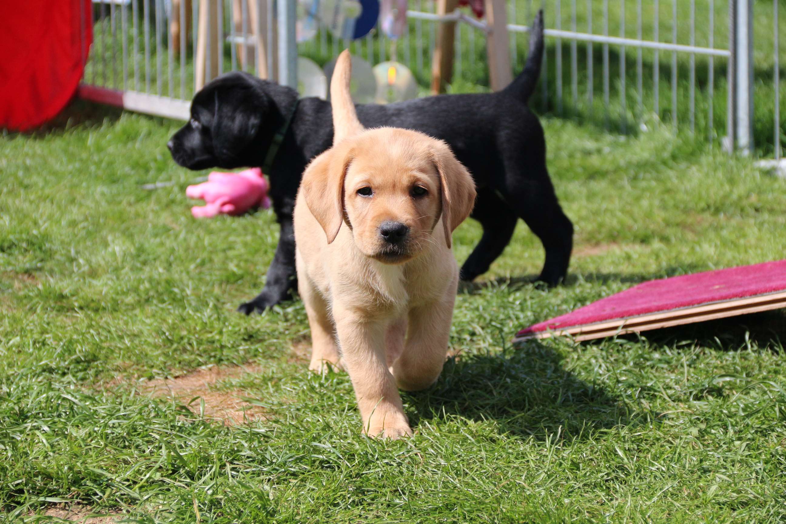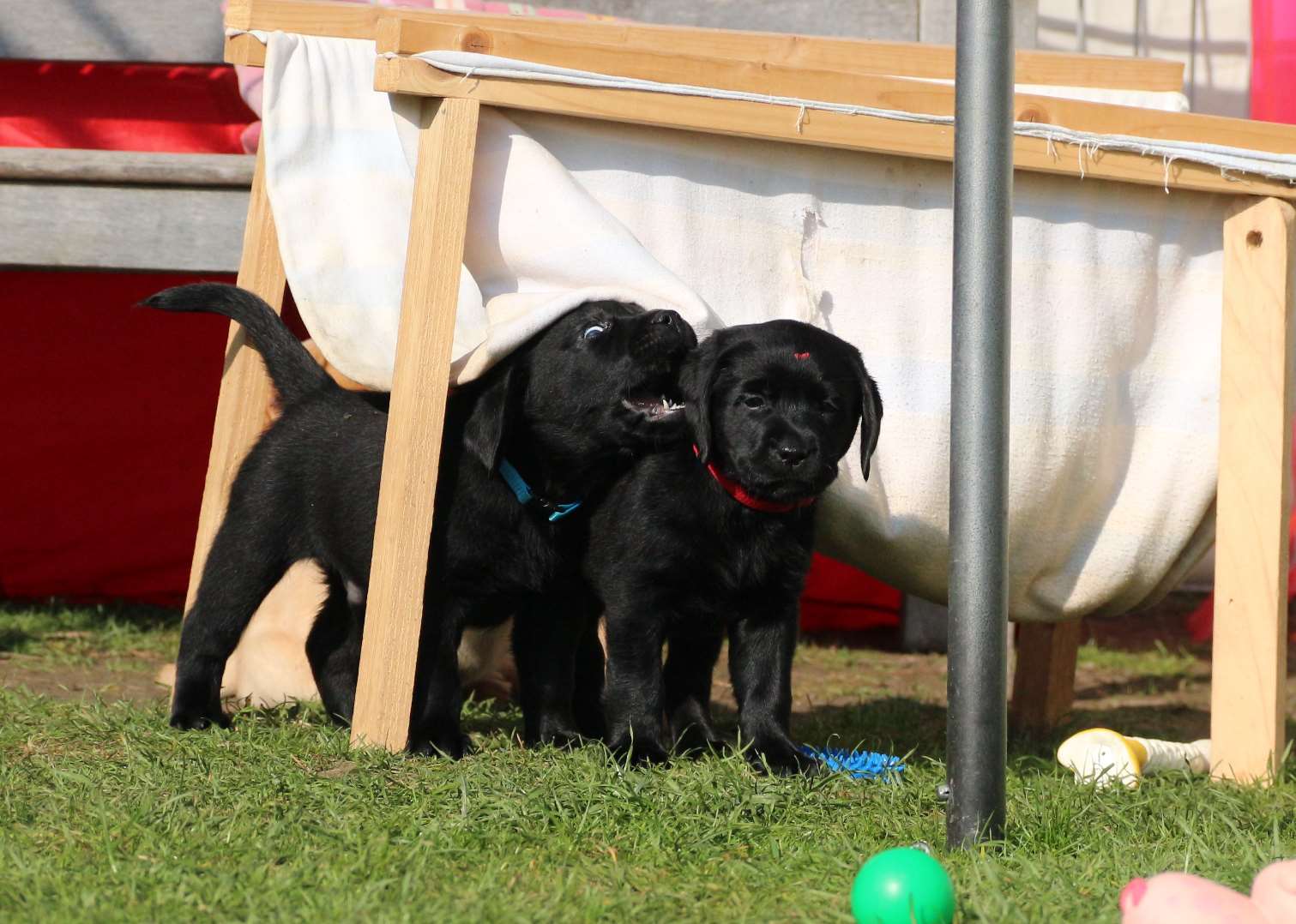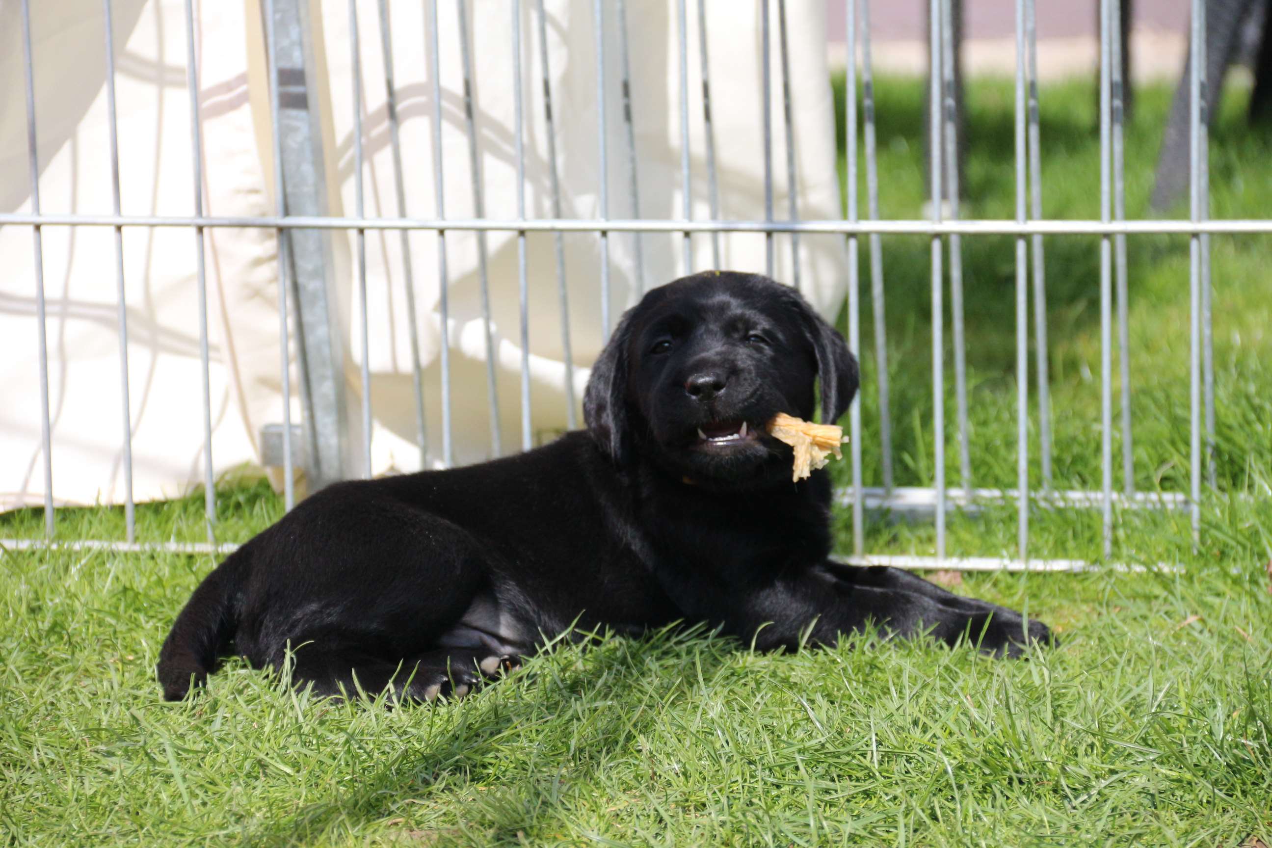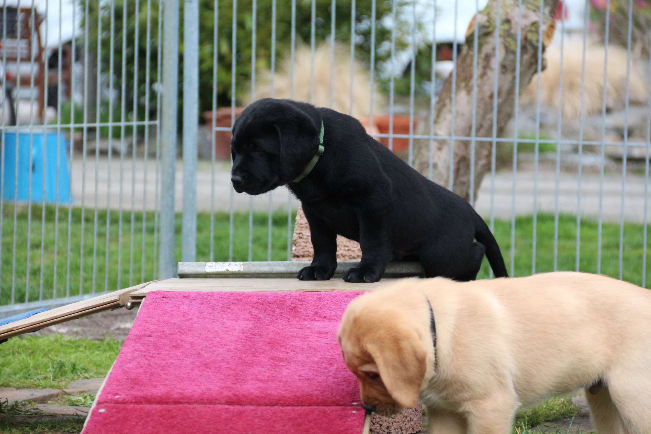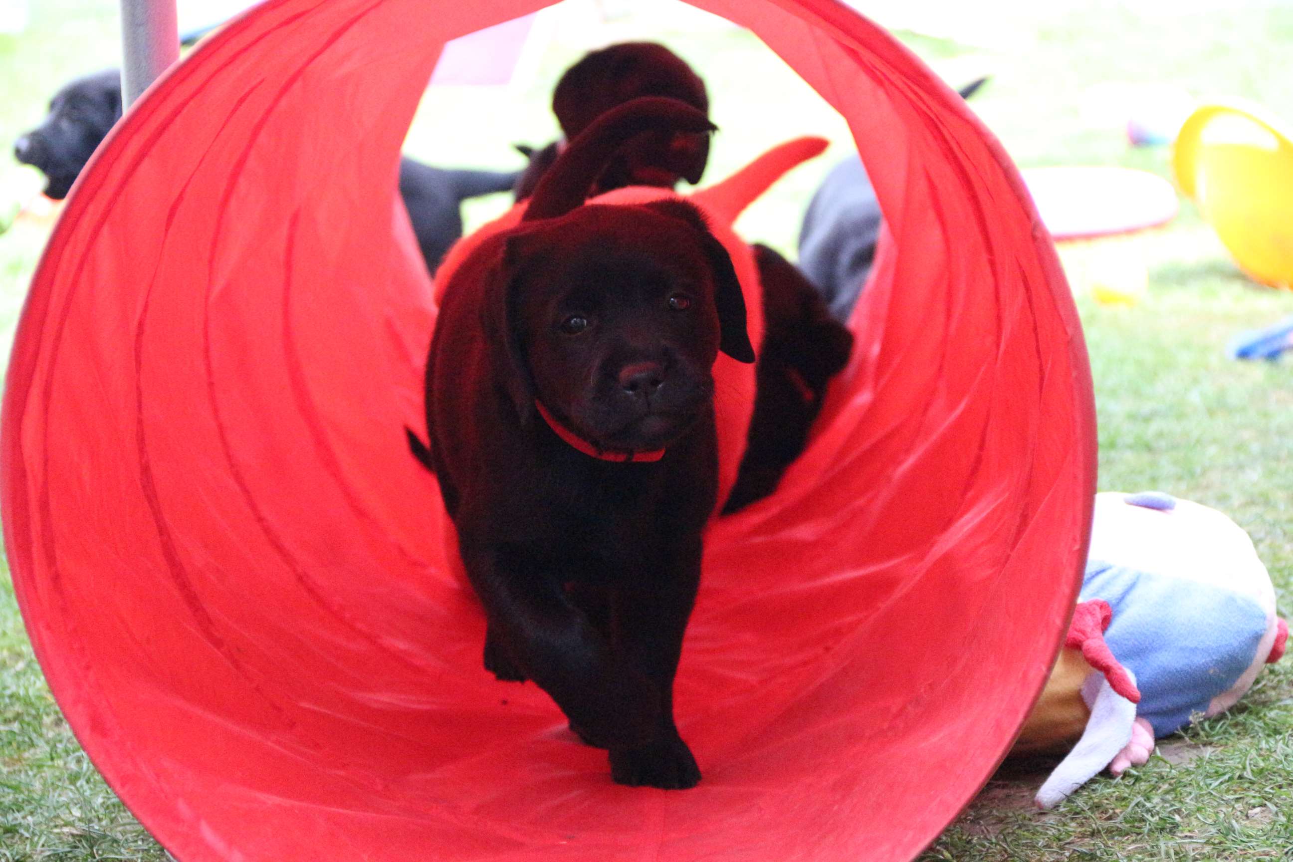 Sonntag, 12.04.15: 7 Wochen sind unsere Hundekinder nun schon. Wir hatten wieder eine sehr kurzweilige Woche mit viel Besuch und die D-chen haben sich toll entwickelt. Man kann ihnen reinstellen was man will, alles wird neugierig untersucht, ausprobiert und getestet. Ich kann viel schreiben, aber ich denke, die Bilder sprechen Bände. Emma und Luna sind schon fleissig am erziehen und machen ihre Sache hervorragend! Wir sind nun täglich von morgens bis abends draussen mit der Bande. Nachts melden sie sich 1 - 2x, wenn sie “müssen” und schlafen bald darauf wieder brav weiter. Bin einfach nur begeistert von allen!! Sie haben bereits die Leine kennengelernt und ersten Spaß mit dem Dummy gehabt. An dieser Stelle ein ganz liebes “Danke” an meine Freundin Marion, die mir immer einen guten Rat weiß. DU BIST DIE BESTE!! Leine, Dummy und bald auch Autofahren stehen nun täglich auf dem Programm... Ich wünsche allen viel Freude mit den Bildern der 7vergangenen Woche :) Die Gewichte lagen heute zwischen 4,7 kg (“Paula” mit dem pinken Band) und 5,9 kg (“Caruso” mit dem grünen Band - er hat “Ben”, unseren hellen Prachtkerl jetzt überholt). Morgen werden die Welpen gechipt und am Mittwoch kommen dann die Zuchtwarte zur Kontrolle... meine geliebte Welpenzeit geht langsam zu Ende und immer wieder kullern deswegen die Tränen :`( so schön und so lange drauf gewartet...