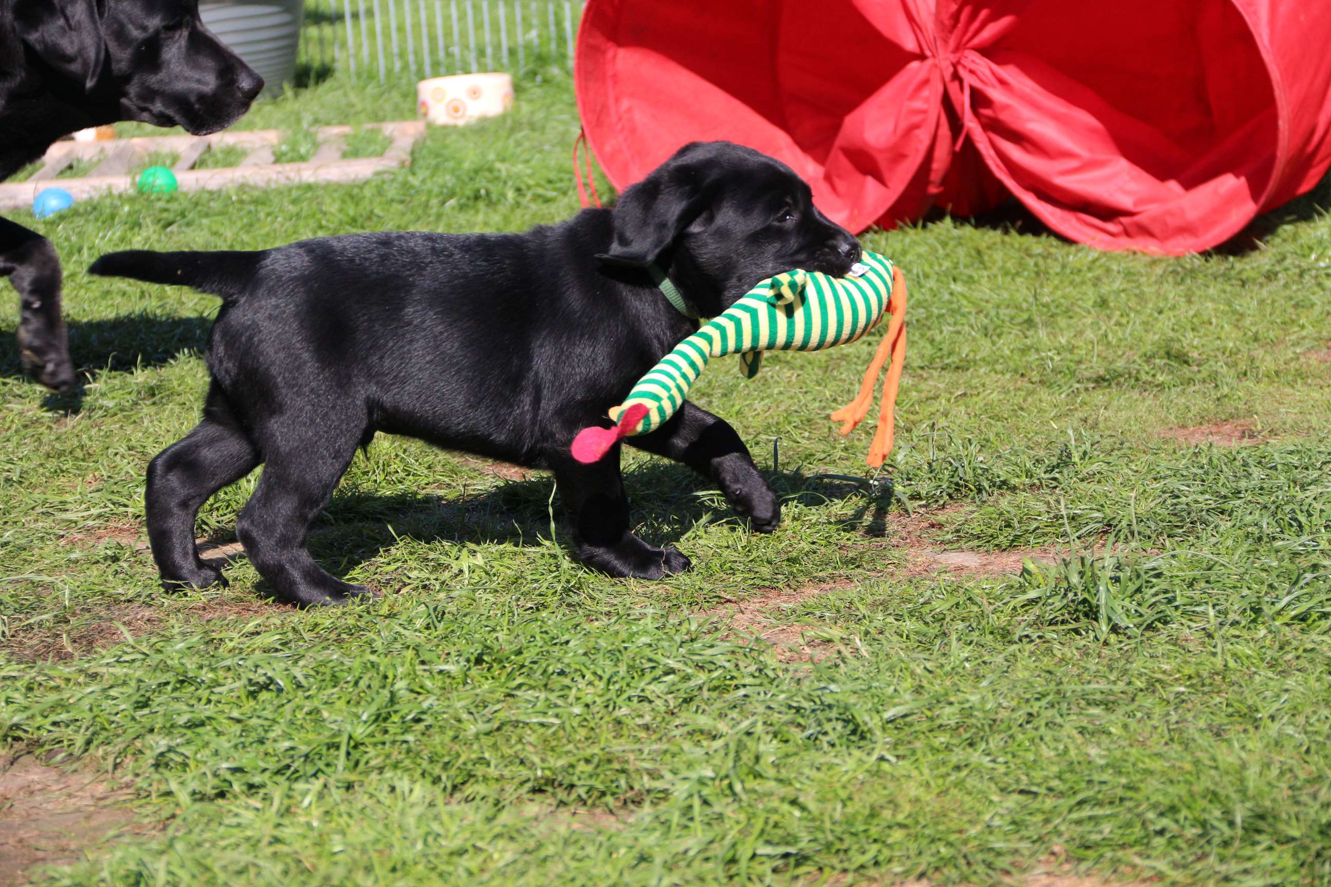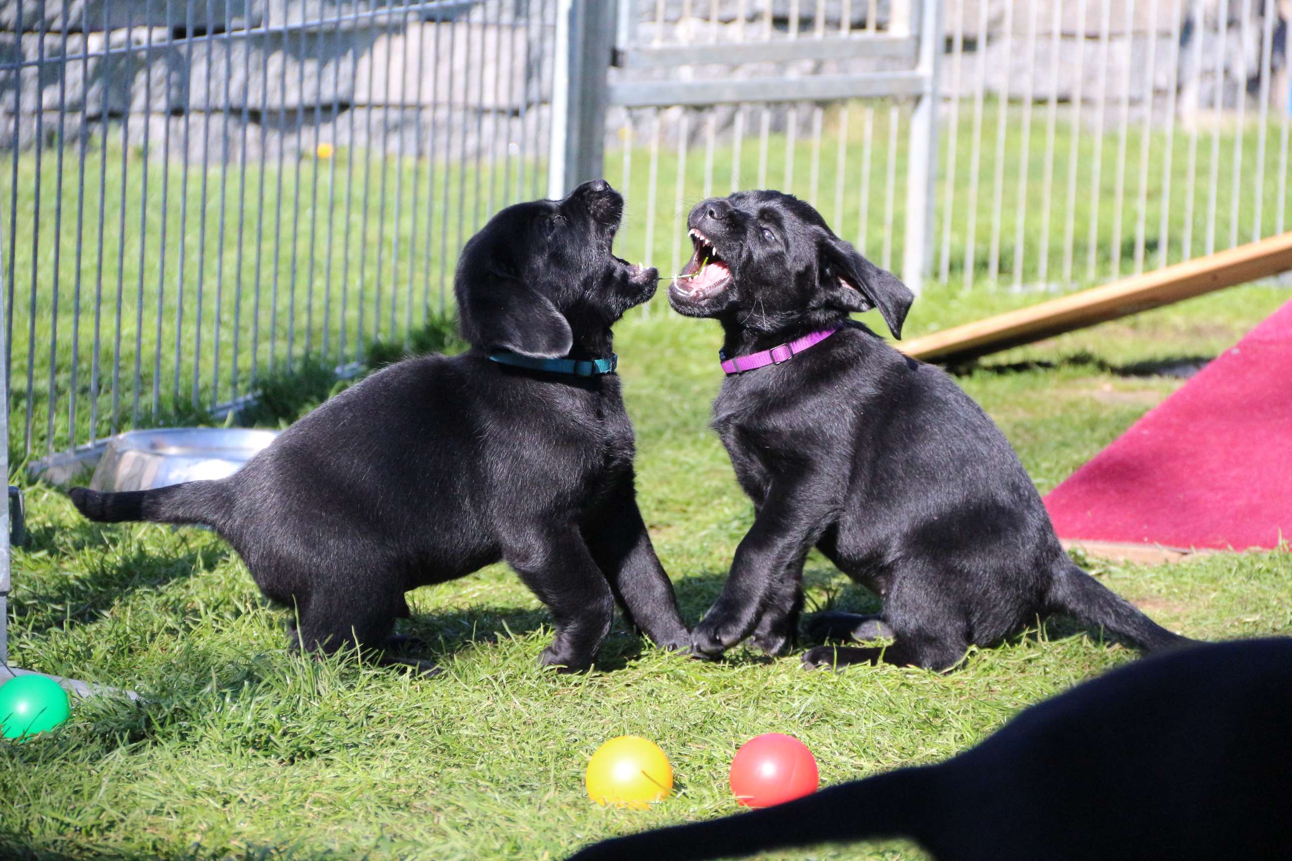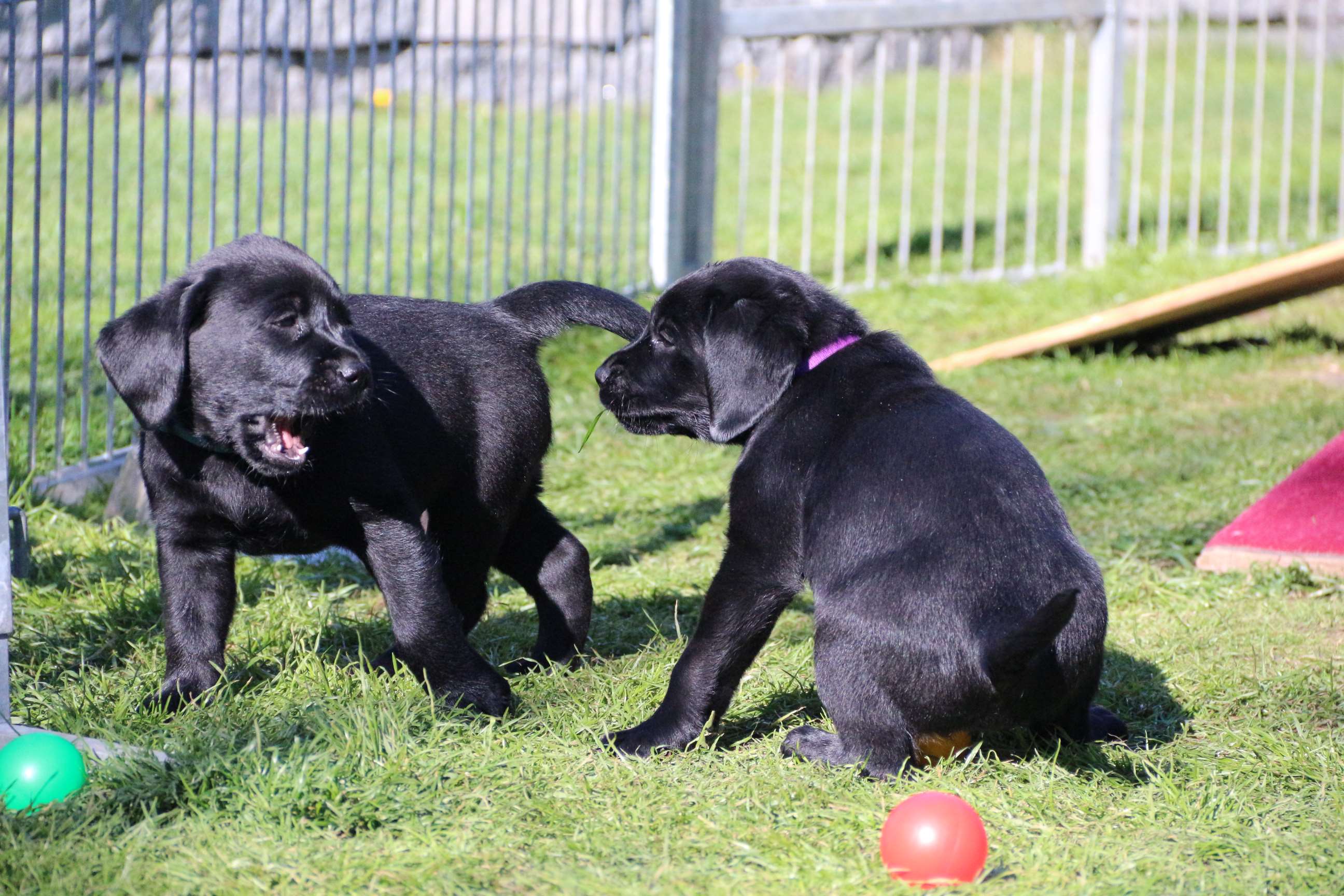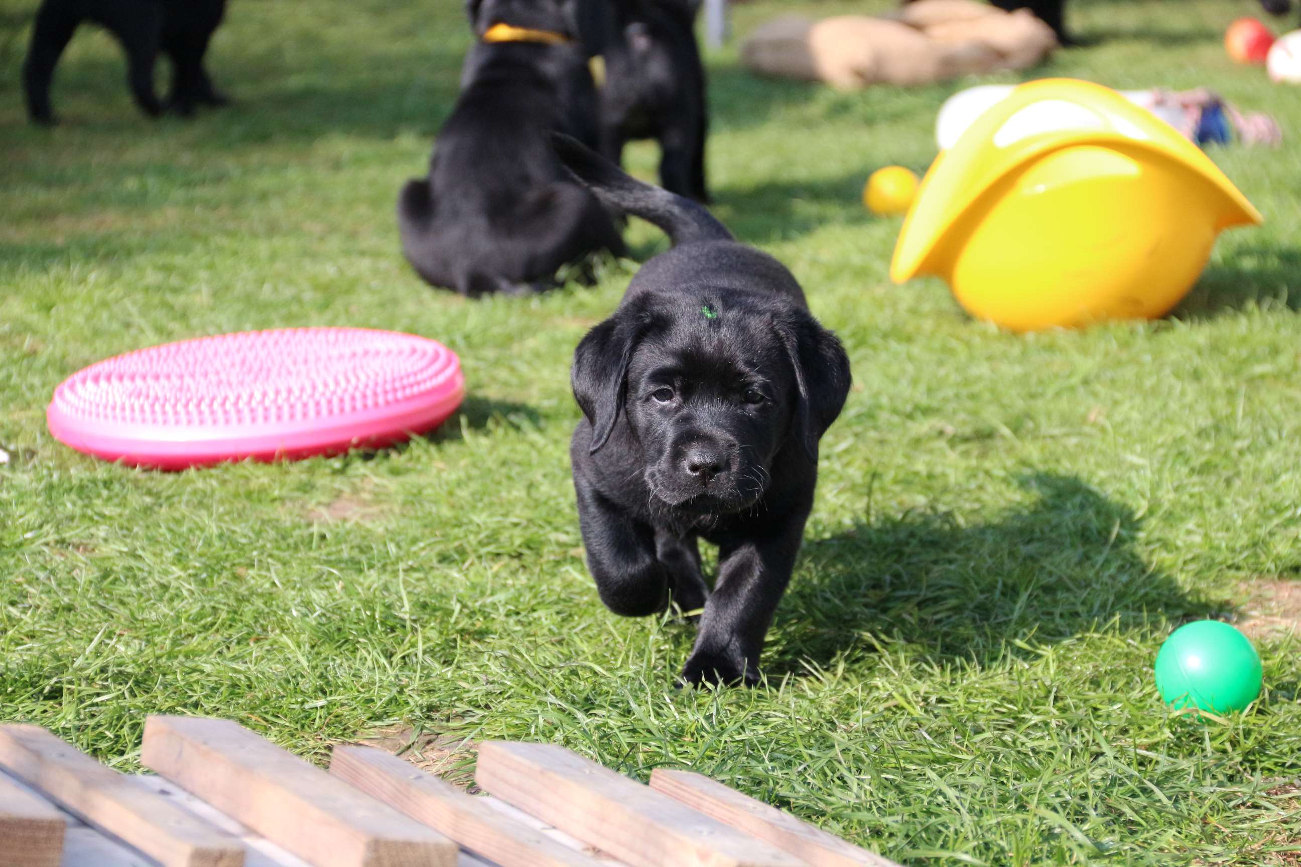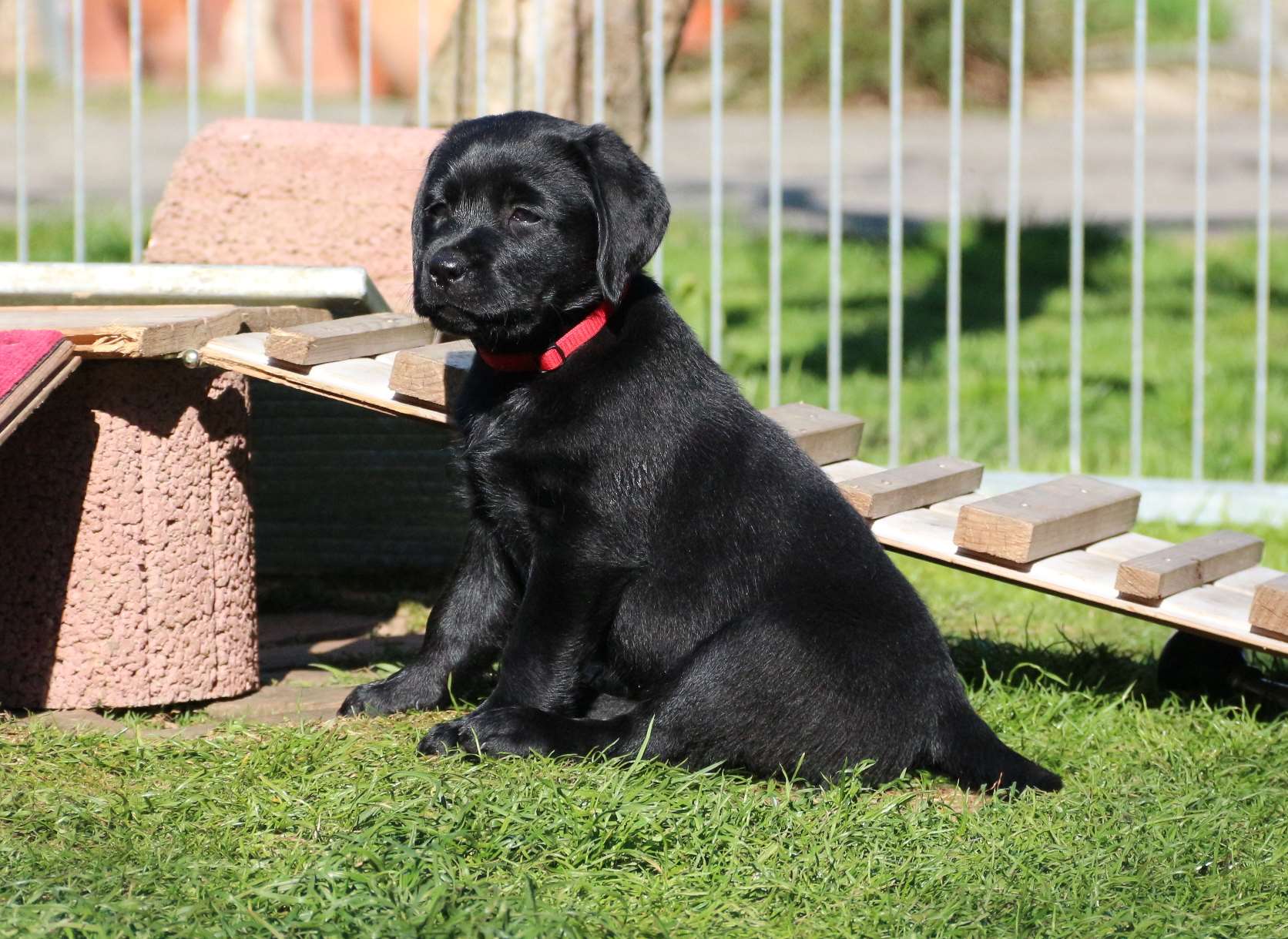Sonntag, 12.04.15: 7 Wochen sind unsere Hundekinder nun schon. Wir hatten wieder eine sehr kurzweilige Woche mit viel Besuch und die D-chen haben sich toll entwickelt. Man kann ihnen reinstellen was man will, alles wird neugierig untersucht, ausprobiert und getestet. Ich kann viel schreiben, aber ich denke, die Bilder sprechen Bände. Emma und Luna sind schon fleissig am erziehen und machen ihre Sache hervorragend! Wir sind nun täglich von morgens bis abends draussen mit der Bande. Nachts melden sie sich 1 - 2x, wenn sie “müssen” und schlafen bald darauf wieder brav weiter. Bin einfach nur begeistert von allen!! Sie haben bereits die Leine kennengelernt und ersten Spaß mit dem Dummy gehabt. An dieser Stelle ein ganz liebes “Danke” an meine Freundin Marion, die mir immer einen guten Rat weiß. DU BIST DIE BESTE!! Leine, Dummy und bald auch Autofahren stehen nun täglich auf dem Programm... Ich wünsche allen viel Freude mit den Bildern der 7vergangenen Woche :) Die Gewichte lagen heute zwischen 4,7 kg (“Paula” mit dem pinken Band) und 5,9 kg (“Caruso” mit dem grünen Band - er hat “Ben”, unseren hellen Prachtkerl jetzt überholt). Morgen werden die Welpen gechipt und am Mittwoch kommen dann die Zuchtwarte zur Kontrolle... meine geliebte Welpenzeit geht langsam zu Ende und immer wieder kullern deswegen die Tränen :`( so schön und so lange drauf gewartet...