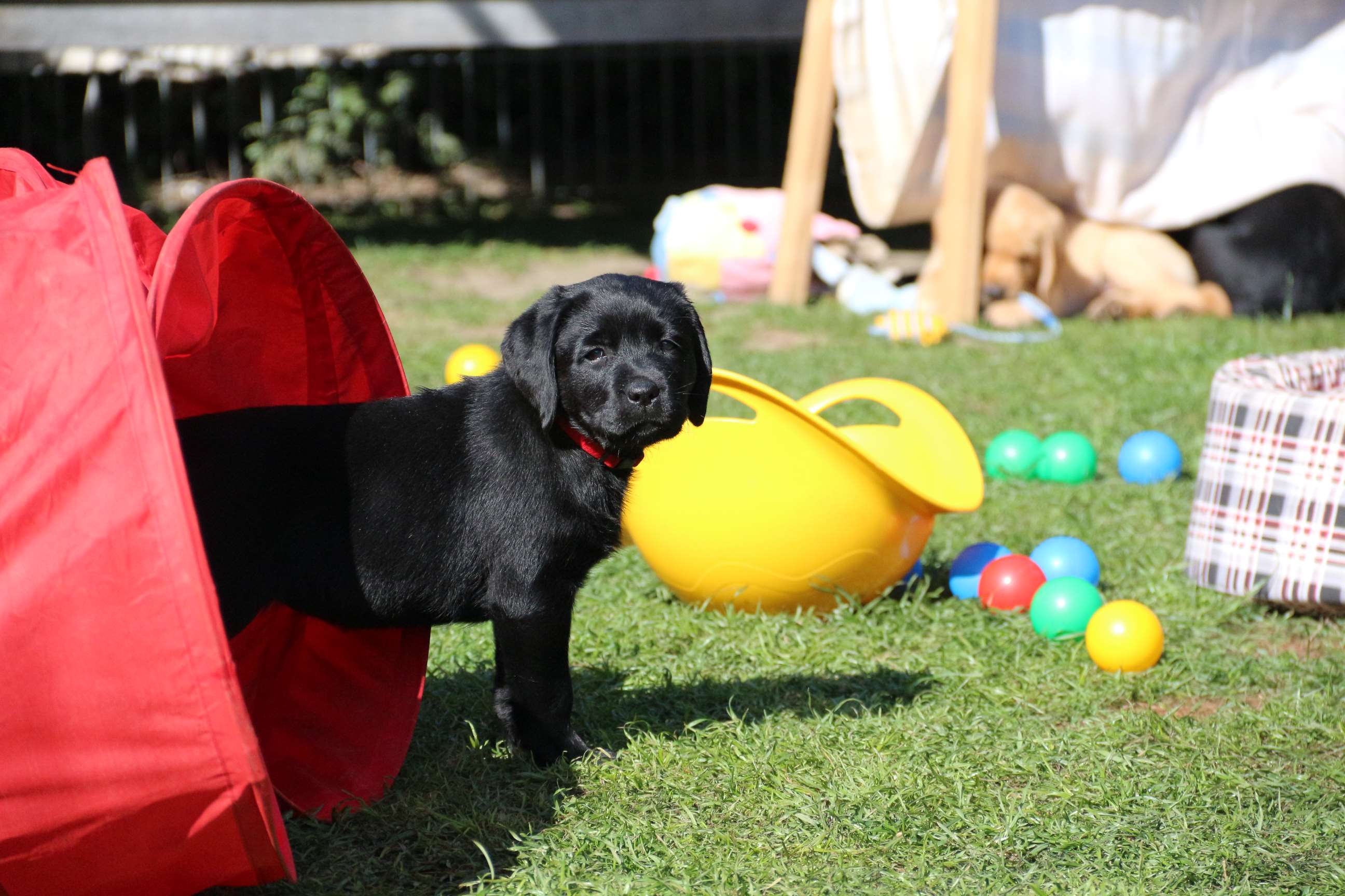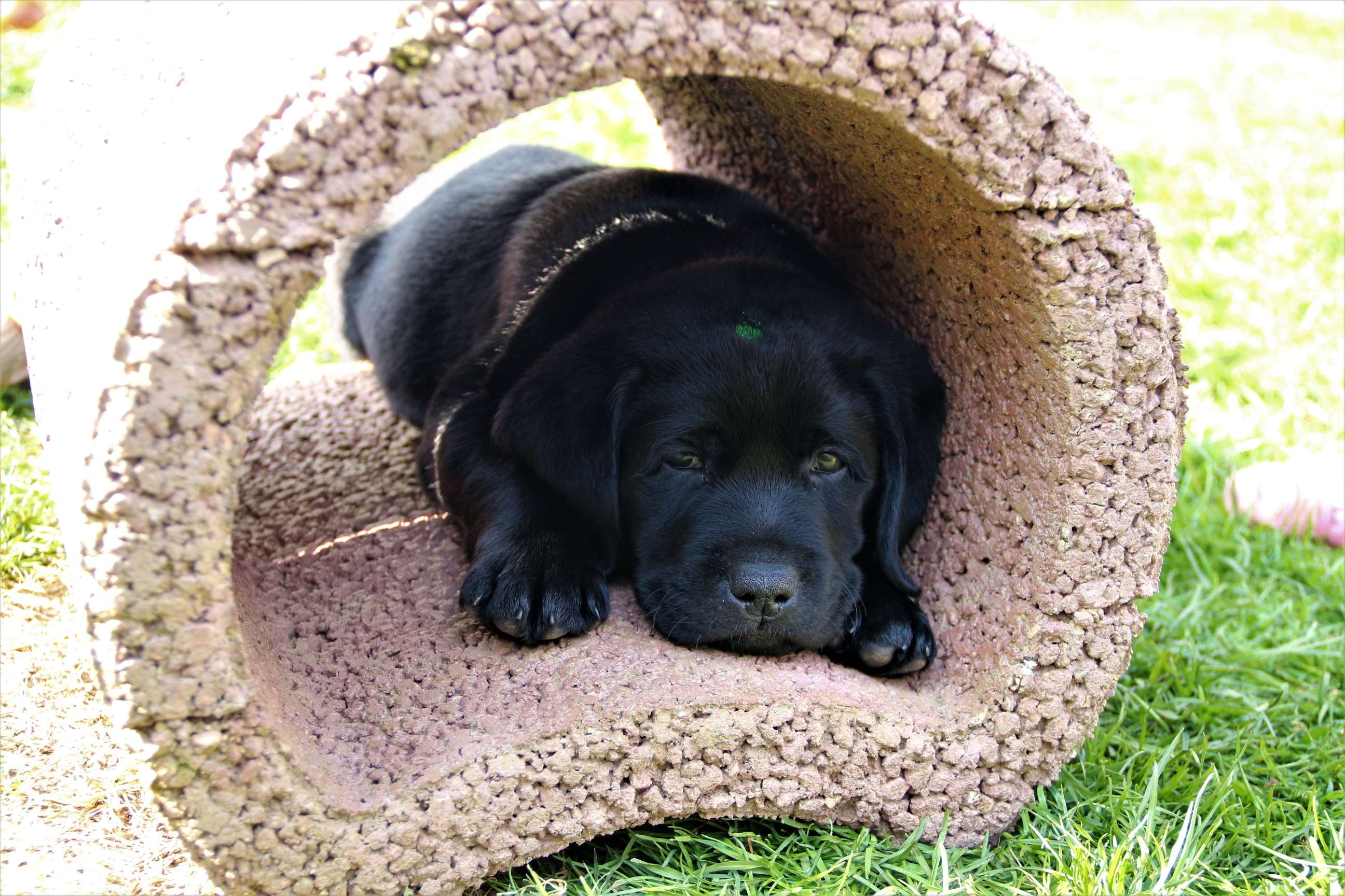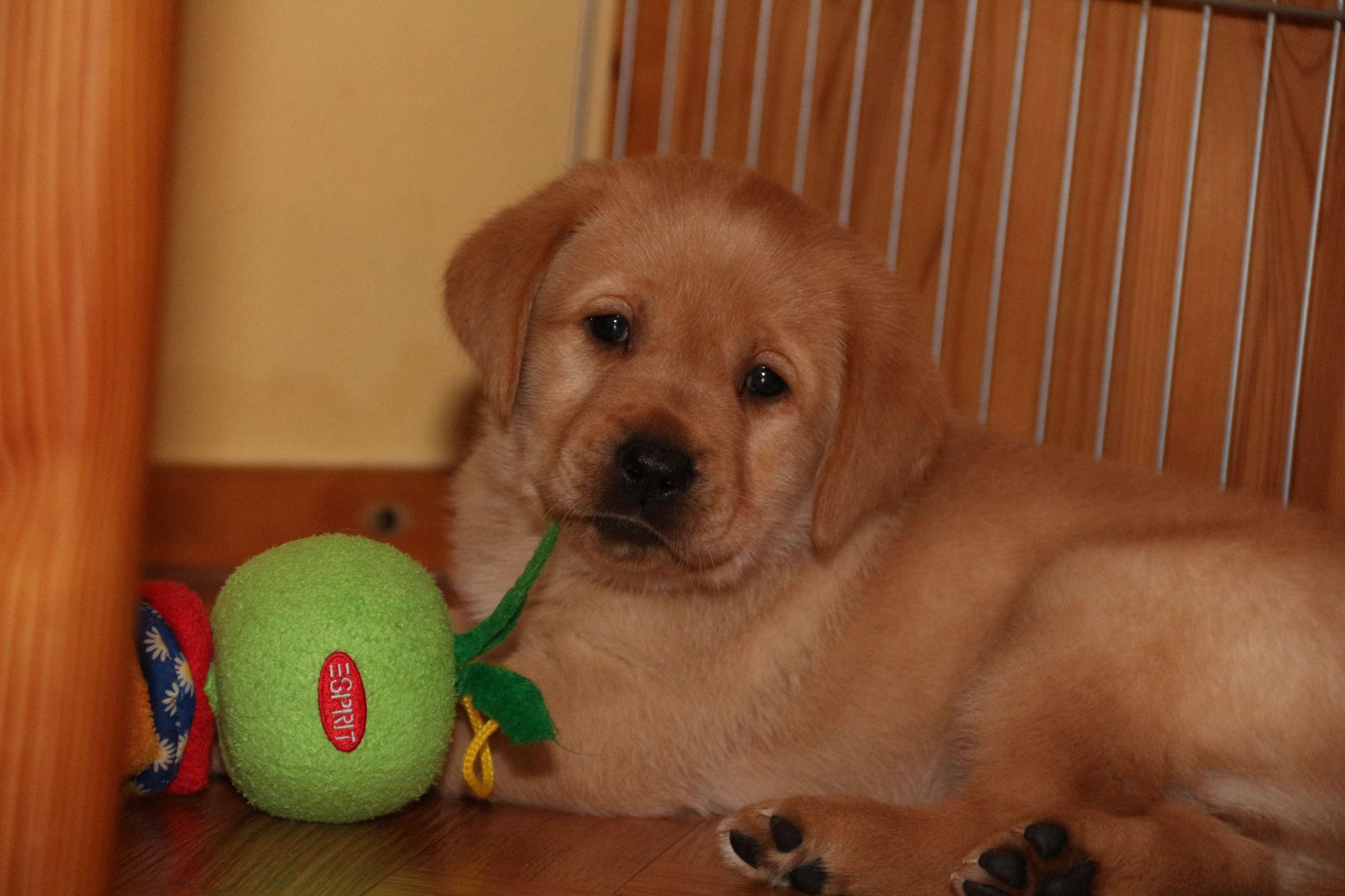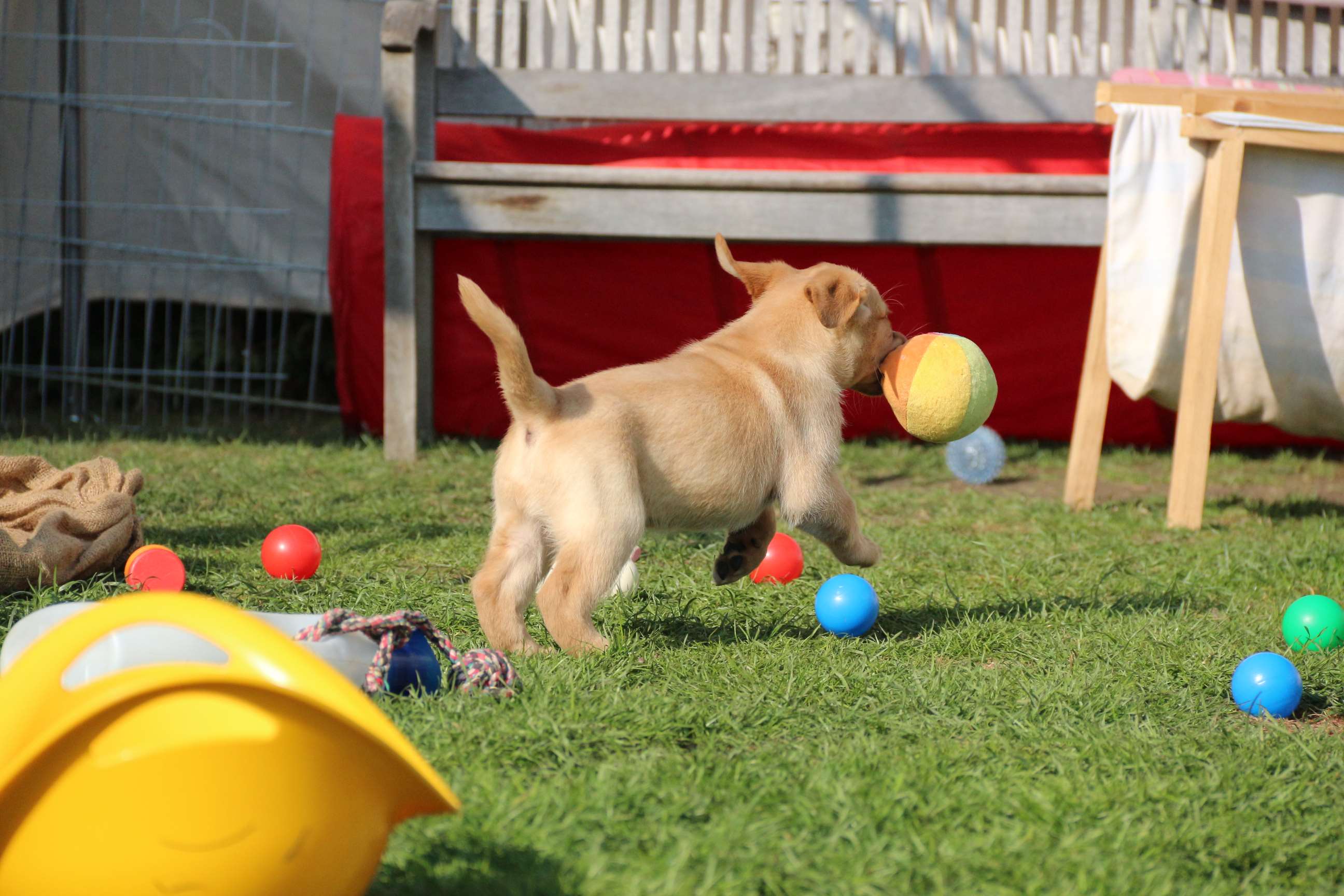 Sonntag, 12.04.15: 7 Wochen sind unsere Hundekinder nun schon. Wir hatten wieder eine sehr kurzweilige Woche mit viel Besuch und die D-chen haben sich toll entwickelt. Man kann ihnen reinstellen was man will, alles wird neugierig untersucht, ausprobiert und getestet. Ich kann viel schreiben, aber ich denke, die Bilder sprechen Bände. Emma und Luna sind schon fleissig am erziehen und machen ihre Sache hervorragend! Wir sind nun täglich von morgens bis abends draussen mit der Bande. Nachts melden sie sich 1 - 2x, wenn sie “müssen” und schlafen bald darauf wieder brav weiter. Bin einfach nur begeistert von allen!! Sie haben bereits die Leine kennengelernt und ersten Spaß mit dem Dummy gehabt. An dieser Stelle ein ganz liebes “Danke” an meine Freundin Marion, die mir immer einen guten Rat weiß. DU BIST DIE BESTE!! Leine, Dummy und bald auch Autofahren stehen nun täglich auf dem Programm... Ich wünsche allen viel Freude mit den Bildern der 7vergangenen Woche :) Die Gewichte lagen heute zwischen 4,7 kg (“Paula” mit dem pinken Band) und 5,9 kg (“Caruso” mit dem grünen Band - er hat “Ben”, unseren hellen Prachtkerl jetzt überholt). Morgen werden die Welpen gechipt und am Mittwoch kommen dann die Zuchtwarte zur Kontrolle... meine geliebte Welpenzeit geht langsam zu Ende und immer wieder kullern deswegen die Tränen :`( so schön und so lange drauf gewartet...