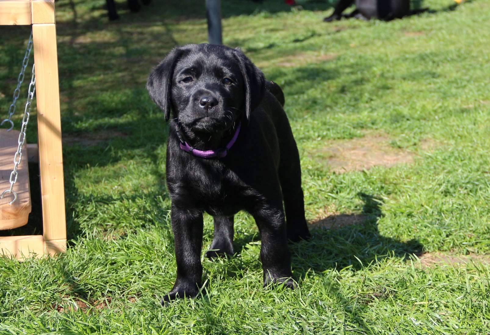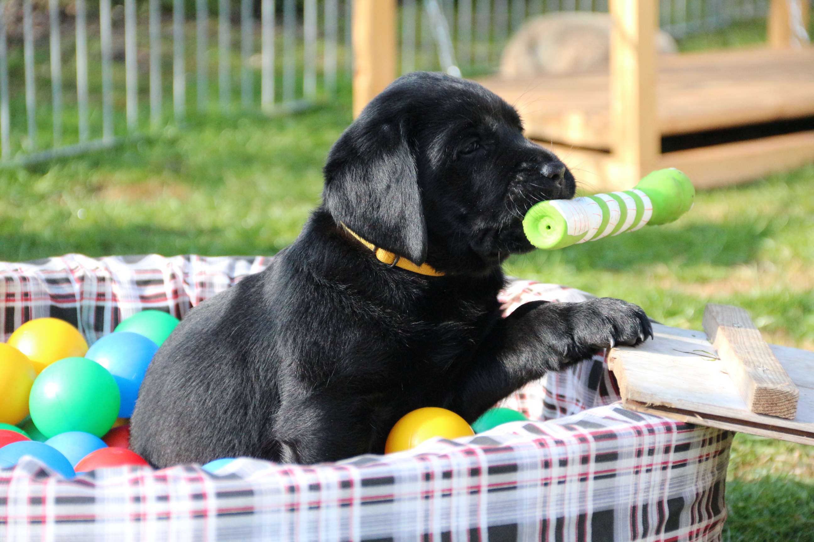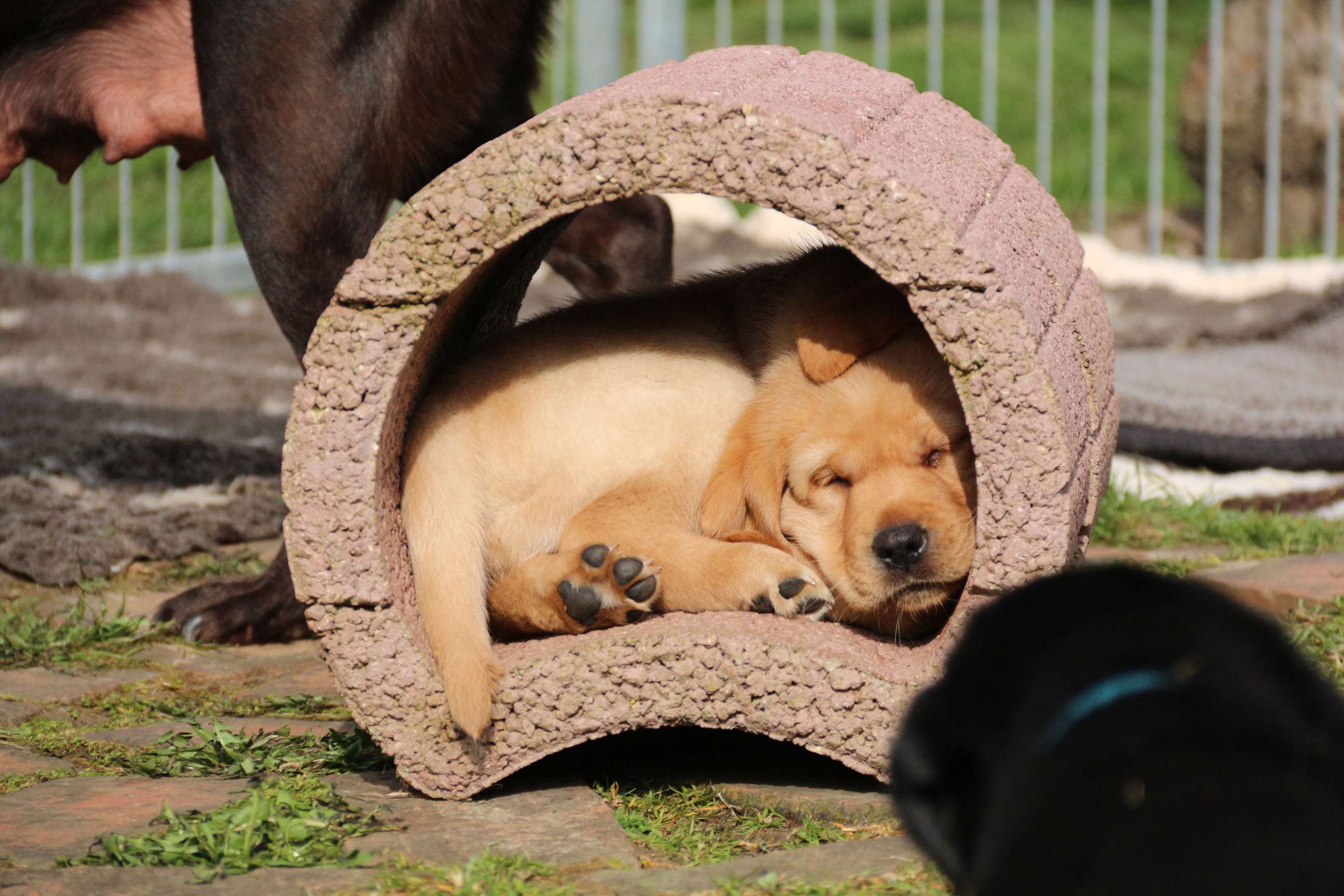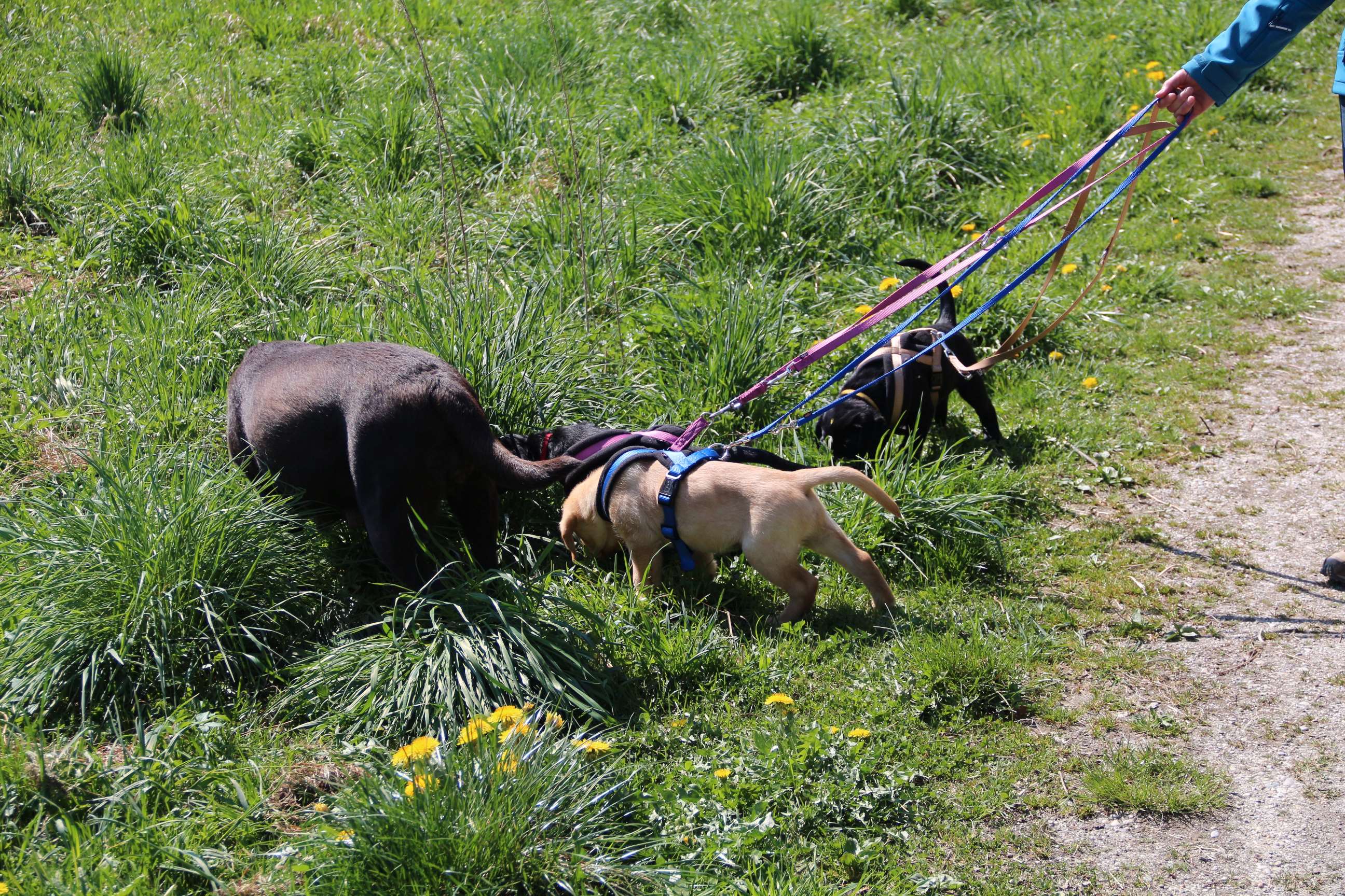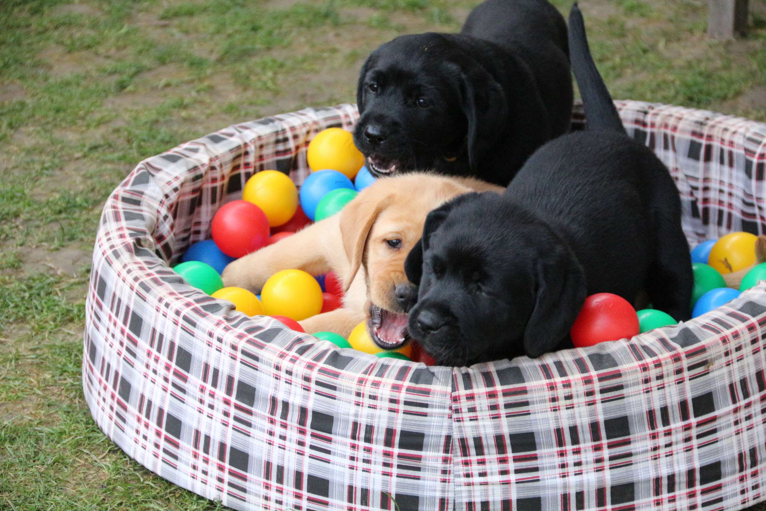 Sonntag, 12.04.15: 7 Wochen sind unsere Hundekinder nun schon. Wir hatten wieder eine sehr kurzweilige Woche mit viel Besuch und die D-chen haben sich toll entwickelt. Man kann ihnen reinstellen was man will, alles wird neugierig untersucht, ausprobiert und getestet. Ich kann viel schreiben, aber ich denke, die Bilder sprechen Bände. Emma und Luna sind schon fleissig am erziehen und machen ihre Sache hervorragend! Wir sind nun täglich von morgens bis abends draussen mit der Bande. Nachts melden sie sich 1 - 2x, wenn sie “müssen” und schlafen bald darauf wieder brav weiter. Bin einfach nur begeistert von allen!! Sie haben bereits die Leine kennengelernt und ersten Spaß mit dem Dummy gehabt. An dieser Stelle ein ganz liebes “Danke” an meine Freundin Marion, die mir immer einen guten Rat weiß. DU BIST DIE BESTE!! Leine, Dummy und bald auch Autofahren stehen nun täglich auf dem Programm... Ich wünsche allen viel Freude mit den Bildern der 7vergangenen Woche :) Die Gewichte lagen heute zwischen 4,7 kg (“Paula” mit dem pinken Band) und 5,9 kg (“Caruso” mit dem grünen Band - er hat “Ben”, unseren hellen Prachtkerl jetzt überholt). Morgen werden die Welpen gechipt und am Mittwoch kommen dann die Zuchtwarte zur Kontrolle... meine geliebte Welpenzeit geht langsam zu Ende und immer wieder kullern deswegen die Tränen :`( so schön und so lange drauf gewartet...