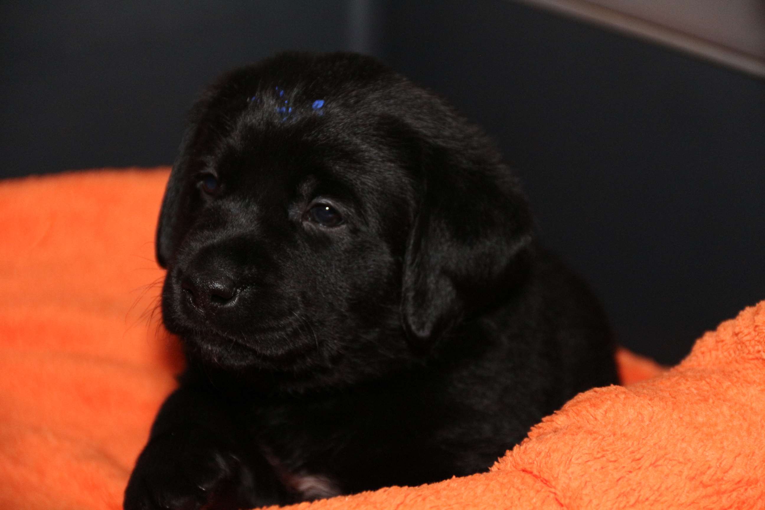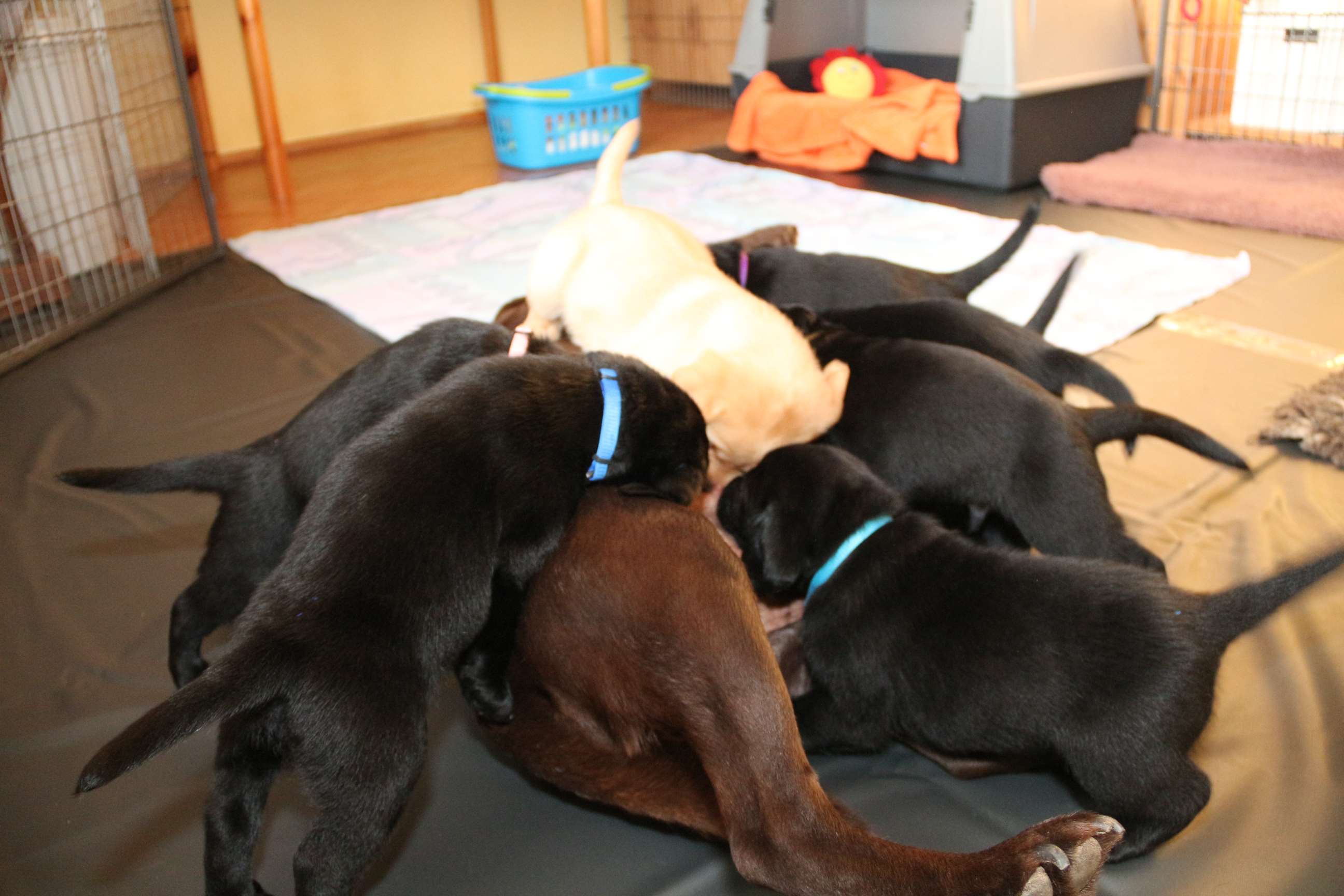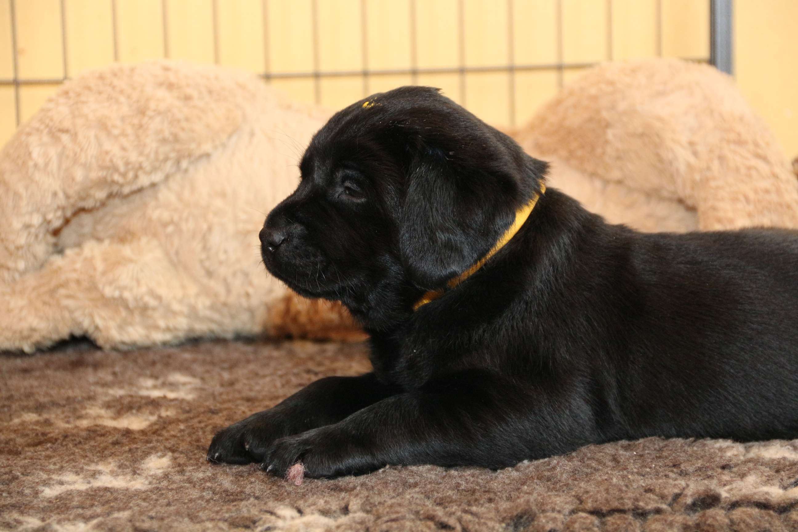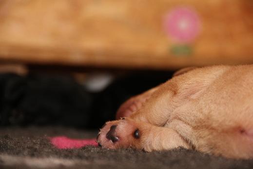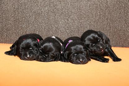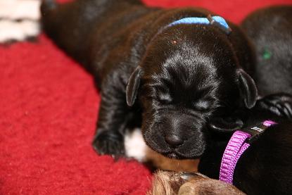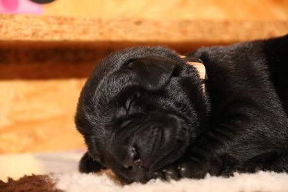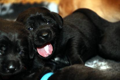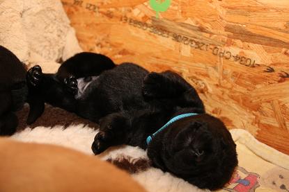 7. März: Vorgestern hat unsere Tierärztin Babys und Mama dem ersten Routinecheck unterzogen und hatte nichts zu beanstanden :) wenns so weitergeht, sind wir mehr als zufrieden! Heute morgen wogen die D-chen zwischen 1050 und 1310 Gramm. Die Brocken sind dabei unser heller Bub, Herr Gelb und Herr Grün. Seit gestern öffnen sie auch nach und nach die Äuglein und das ist sooo allerliebst... <3 Zuerst nur ein Dreieck innen und am nächsten Tag dann schon ganz. Wer nun denkt, das sind die Schwergewichte, der täuscht sich! Die “kleineren” Prinzessinnen waren die vorwitzigen und neugierigen! Gefolgt heute dann vom schwarzen Rüden mit dem gelben Band und unserem hellen Farbklecks :D Auch das Aufstehen und durch-die-Kiste-wackeln versuchen sie schon ganz eifrig. Hier haben die dicken Popos leider das Nachsehen... sind viiiel zu schwer für die kurzen Beinchen :) :) Es ist so niedlich <3 <3