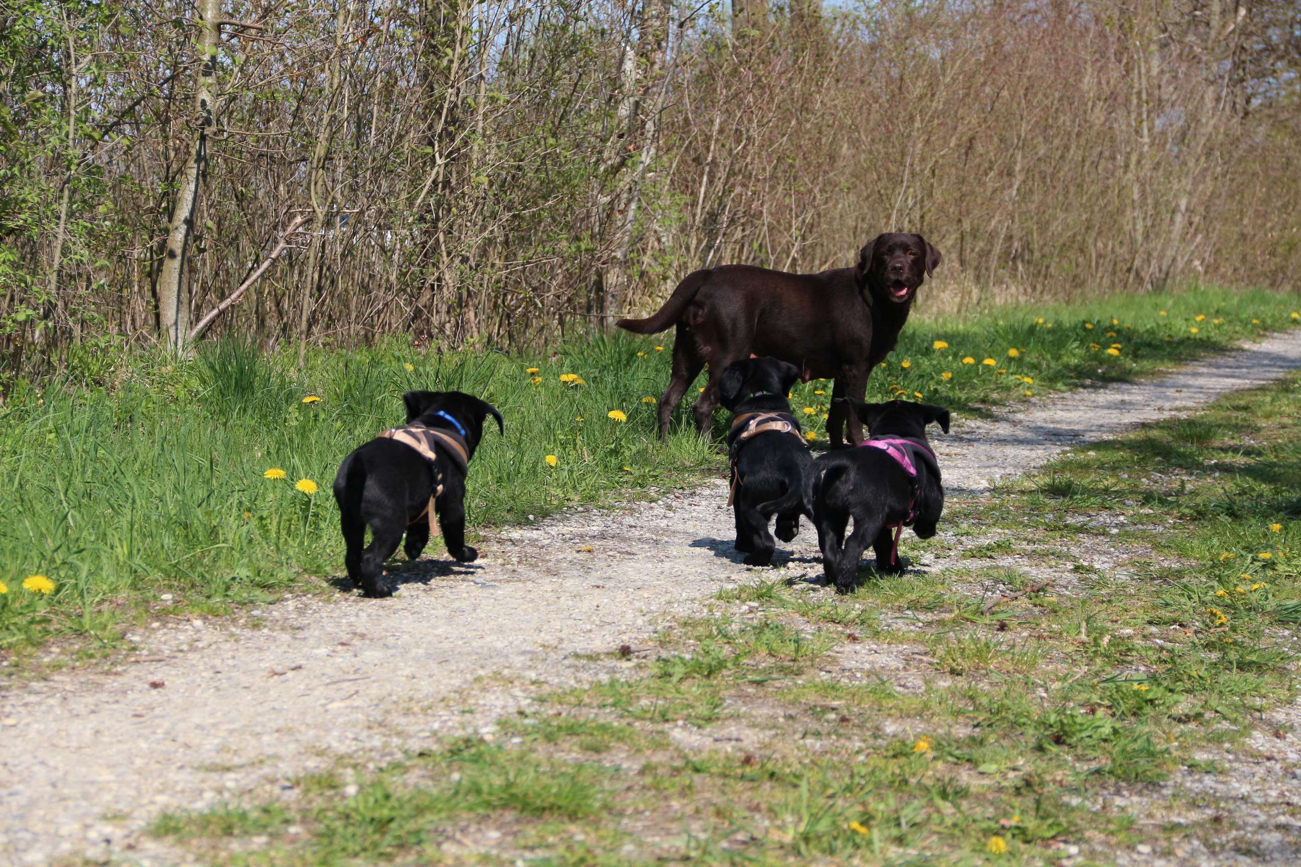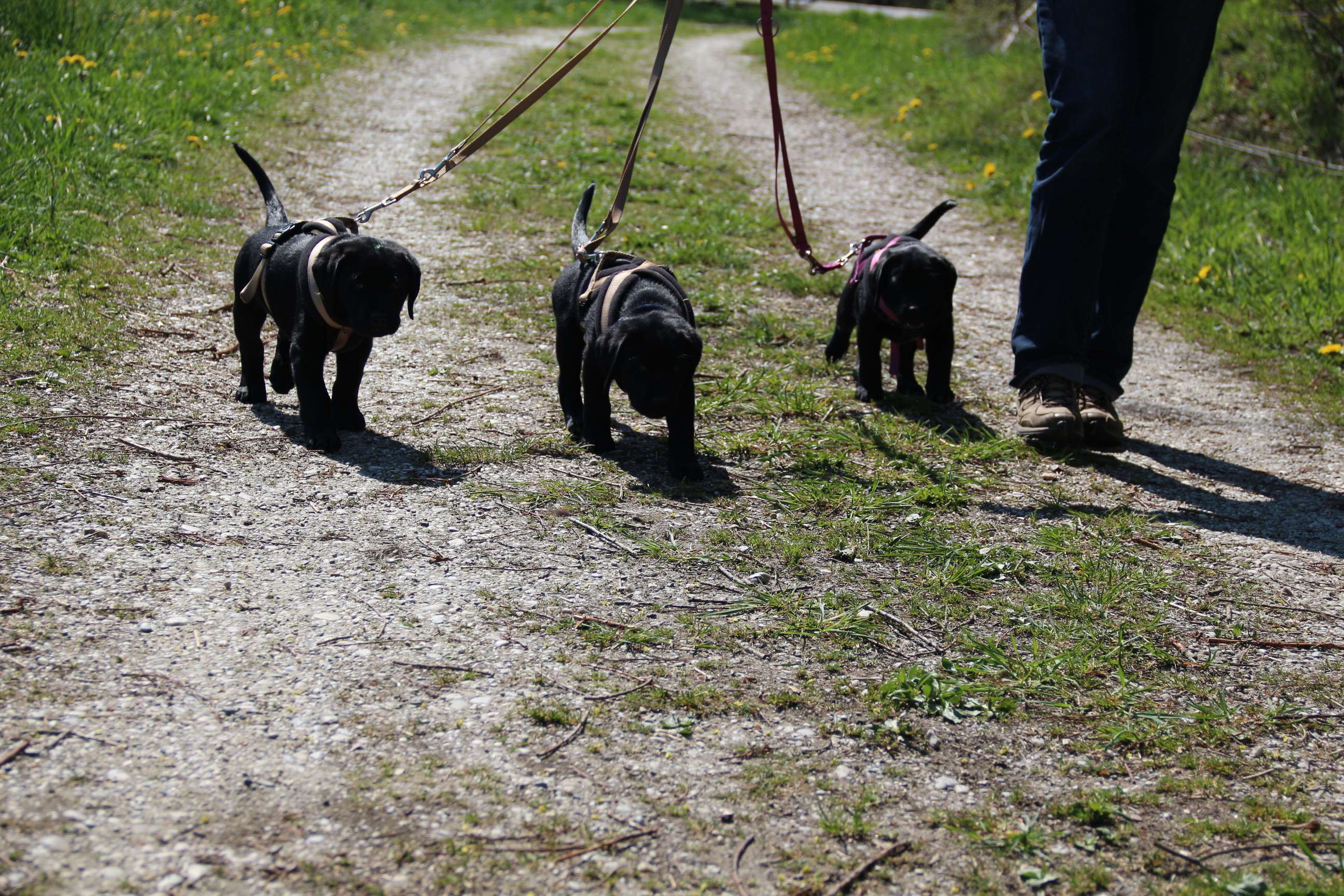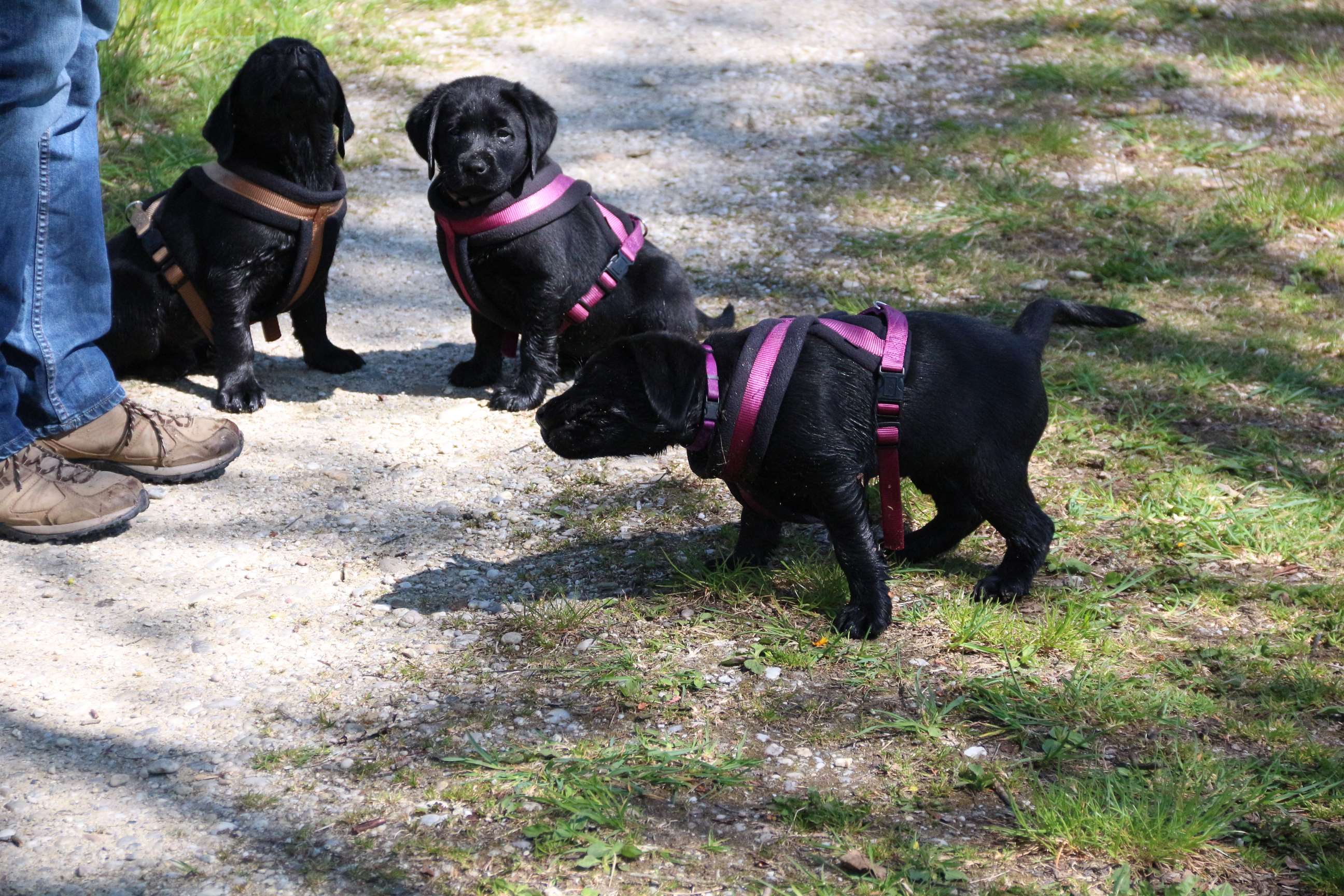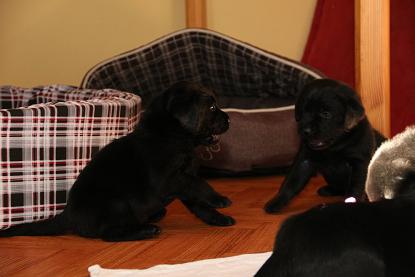 28. März: Morgen werden unsere Babys schon 5 Wochen alt und wir haben die Halbzeit damit überschritten :) Wir hatten seit letztem Wochenende jeden Tag Besuch - schließlich wollen und sollen ja alle Familien ihre künftigen Familienmitglieder live kennenlernen. Eine schöne und kurzweilige Woche. Die Welpen haben alles super mitgemacht. Sie sind frech, neugierig und auch der Hier-Pfiff ist schon ein Begriff - zu schön, wenn sie das Futter erahnen :) :) Wir haben schon einige Abstecher in den Garten gemacht, wie man sieht. Da wurde gleich mal Bekanntschaft mit dem Geräusch einer Säge aus Nachbars Garten gemacht, Flugzeuge, Traktoren etc. (was uns schon nicht mehr auffällt) aber sie haben bloß geguckt und die Ohren “gespitzt”. Ausserdem sind sie Staubsauger-tauglich und würden seeehr gerne beim Wischen helfen :D